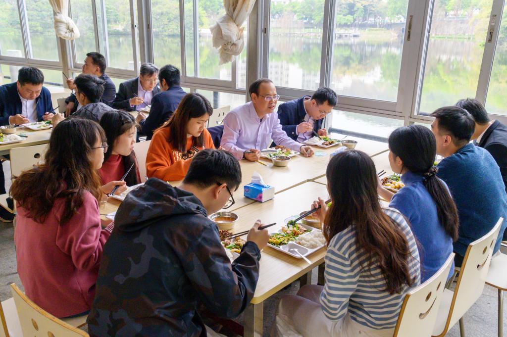 本网讯 3月1日,新学期开学第一天。龙洞校区春暖花开,风和日丽。校长邱学青率相关部门、单位负责人,在龙洞校区巡查了每一间课室的上课情况,检查了教师休息室、洗手间等环境卫生;分别与相关学院举行3场调研座谈会,听取学院工作汇报,并作一一回应和指导;与学生在学校食堂共进午餐,并和学生亲切交谈。