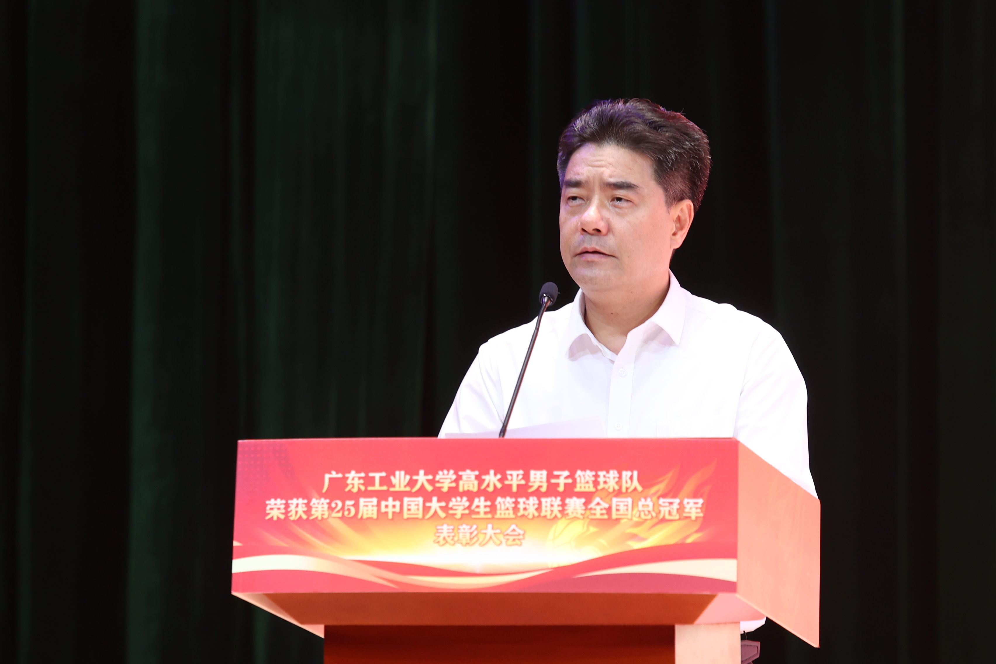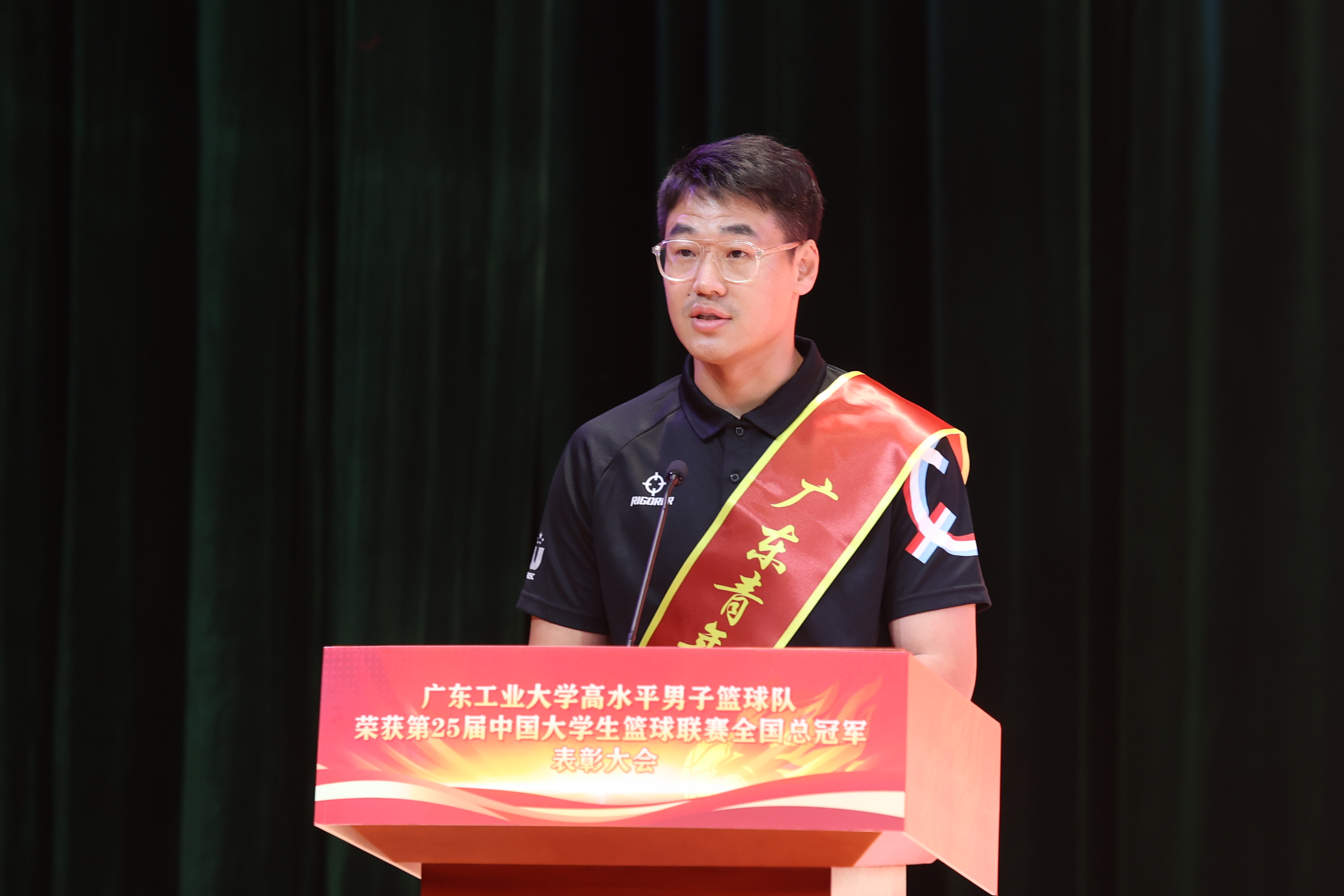 邱学青宣读学校《关于表彰高水平男子篮球队的决定》。学校男篮是新时代广工青年集体的优秀代表。他们展现了脚踏实地、笃行不怠的实干品格,迎难而上、追求卓越的拼搏精神,敢于胜利、为校争光的进取特质,以强烈的历史主动精神寻求突破和超越。为弘扬学校男篮精神,经学校研究决定,授予广工男子篮球队“安博app最新版下载先进集体”称号。学校希望全体师生以男子篮球队为榜样,踔厉奋发、勇攀高峰,为全面推进高水平创新型大学建设作出新的更大贡献,为全面建设社会主义现代化国家、全面推进中华民族伟大复兴而团结奋斗。