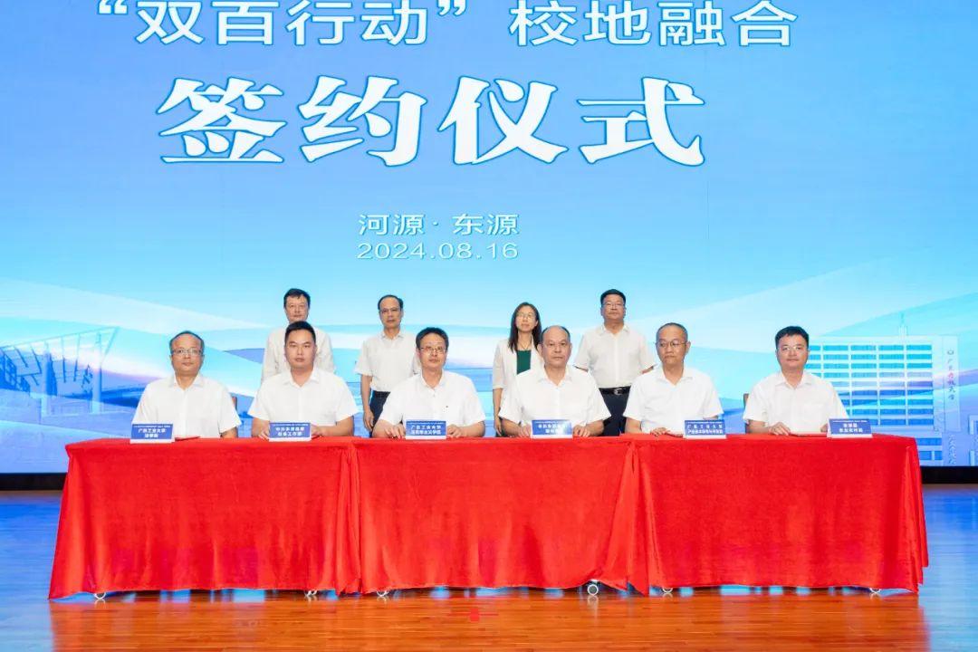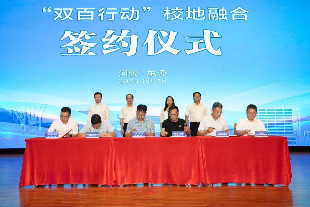 会上还举行了广工-东源校地融合签约仪式。计算机学院-河源太二农业科技有限公司、机电工程学院-河源富马硬质合金股份有限公司、继续教育学院-东源县城乡投公司,马克思主义学院-县委宣传部、产业技术研究与开发院-县农业农村局、法学院-县委社会工作部分别进行结对签约。