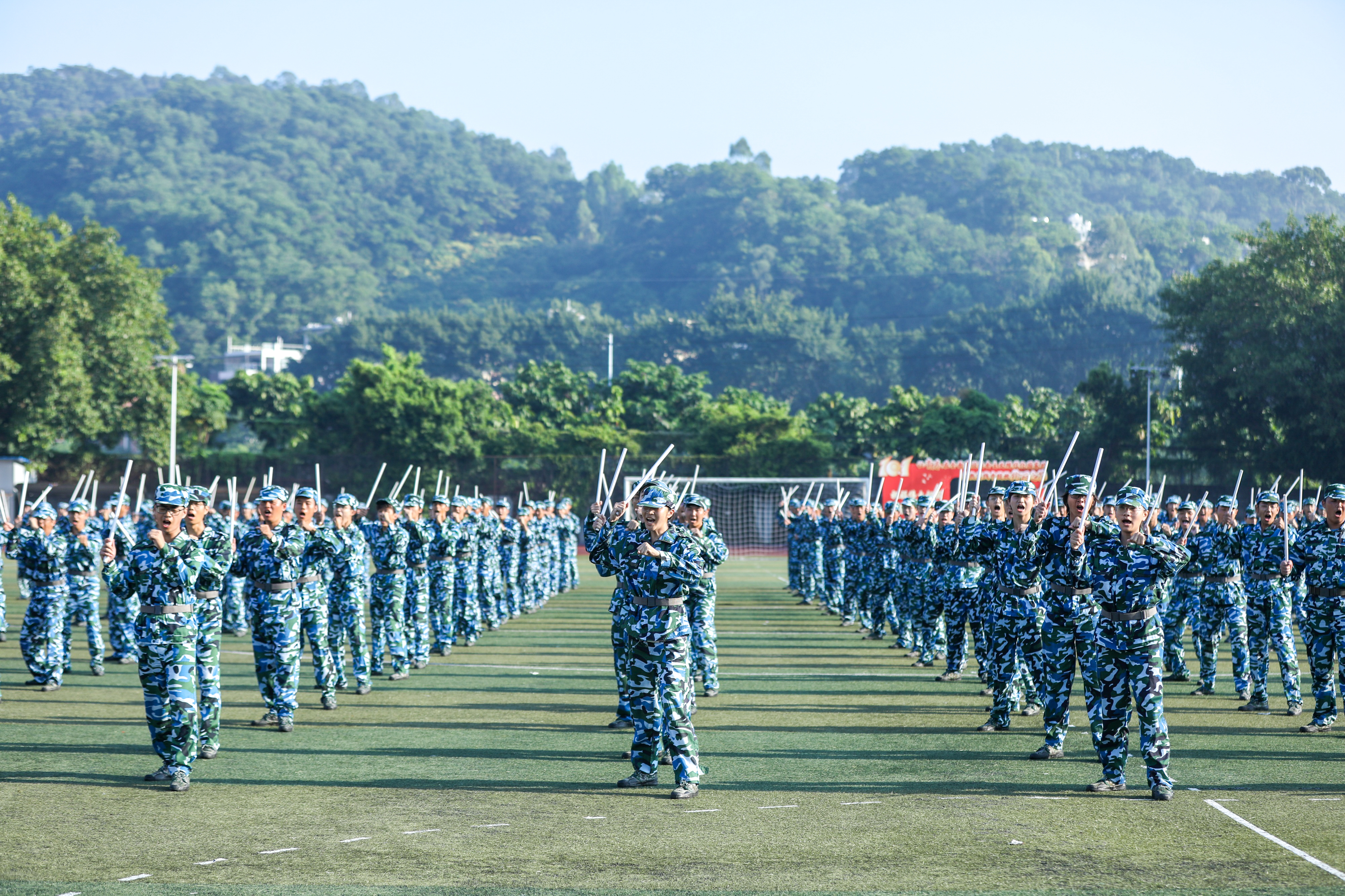 分列式及军事特色科目汇报中,同学们士气高昂、口号响亮、步伐矫健、队列整齐。军体拳、匕首操、短棍术、应急长棍……同学们眼神坚定、身姿矫健、口号铿锵,少年的热血与军魂,在此刻完美融合。军体拳中无惧烈日的坚毅,匕首操中铁血与柔情的结合,旗语方队有力的挥旗……每一个科目都是对他们努力与拼搏的最佳呈现。现场气氛热火朝天,男儿的铿锵斗志和女兵的巾帼风采赢得师生们阵阵掌声。