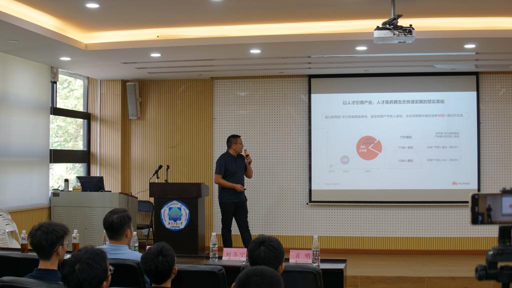 安博app最新版下载同步举行华为全联接2021智能基座专场活动,百余名师生参加,收看了以“深耕数字化”为主题背景的华为全联接2021智能基座峰会直播。活动现场,华为昇腾技术专家陈常水围绕新工科人才的深化培养、共建昇腾的繁荣生态、助推人工智能产业快速发展等内容作报告,并与同学们进行了深入交流,气氛热烈。