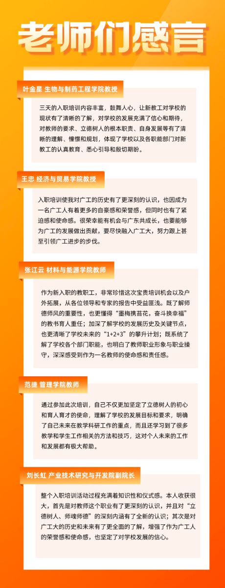 自动化学院的新教师陈辞发表了他的入职感言:作为广工新教师的一员,自己所肩负的责任重大,职业使命光荣。他用心阅读体味自己所带的41名新生41个不同故事,他积极参与深远空间探测等国家重大项目的实施,向着习近平总书记强调的“教师要成为大先生,做学生为学、为事、为人的示范,促进学生成长为全面发展的人。要研究真问题,着眼世界学术前沿和国家重大需求,致力于解决实际问题”方向努力拼搏。
