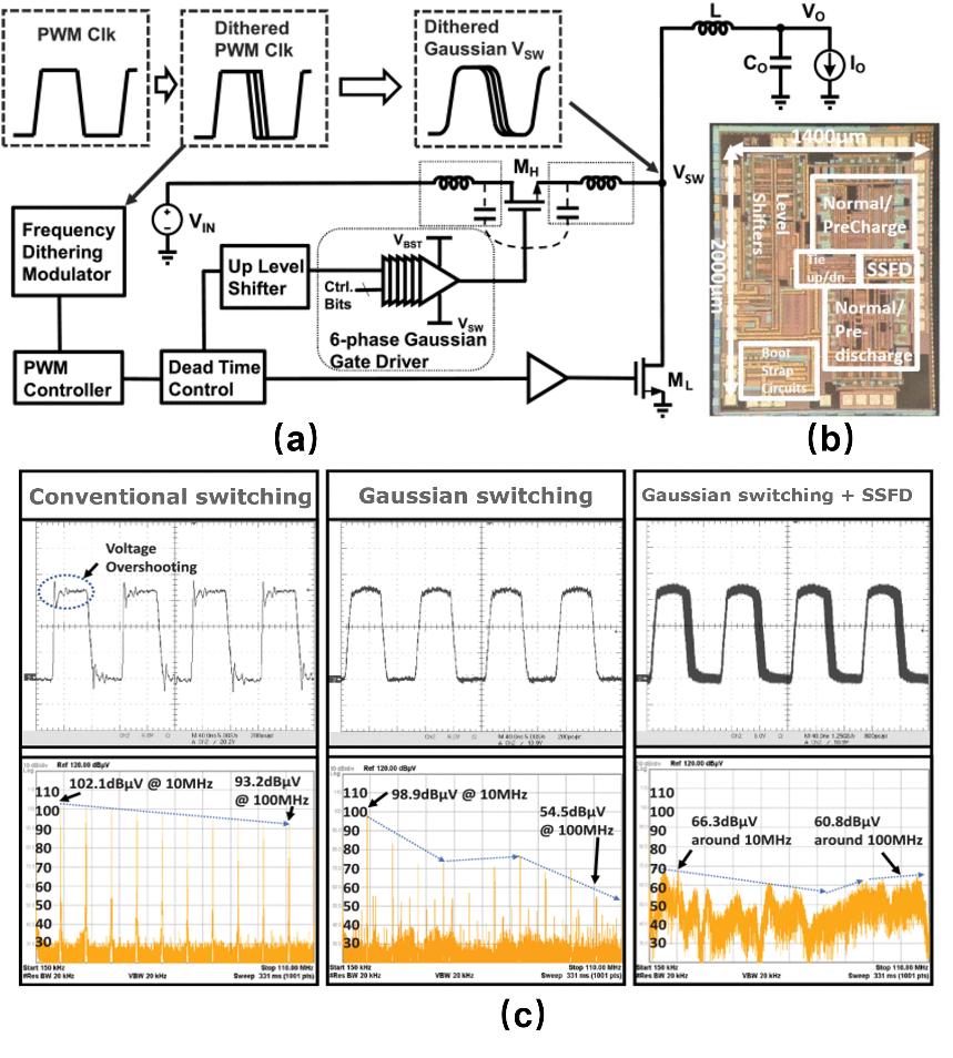 氮化镓等第三代半导体功率器件近年来在车规级大功率开关电源中被广泛应用。受高开关频率和高电压所引入高电磁干扰(EMI)的影响,汽车内部电磁兼容性设计面临挑战。本论文设计了一种10MHz 40V的氮化镓栅极驱动芯片,在不需要外接滤波器情况下,从电路层面降低开关电源产生的电磁干扰。该方案结合了高斯开关控制和频率抖动技术方案的优点,实现了从低频到高频超宽频(0.2MHz-500MHz)的电磁干扰抑制效果,电磁辐射抑制比最高可达38.7dB。在应用该方案的同时,电路还保持了较高的能量转化效率(85.2%),并满足苛刻的节能标准和CISPR-25 EMC电磁兼容性标准。该芯片采用0.18μm高压CMOS工艺进行流片验证,主要性能指标达到国际一流水准。