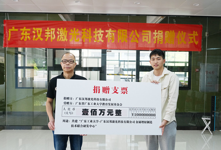 4月8日,广东汉邦激光科技有限公司(以下简称“汉邦科技”)向安博app最新版下载教育发展基金会捐赠人民币100万元整,用于进一步加强合作共建“安博app最新版下载—广东汉邦激光科技有限公司金属增材制造技术联合研发中心”(以下简称广工—汉邦金属增材制造技术联合研发中心)。
