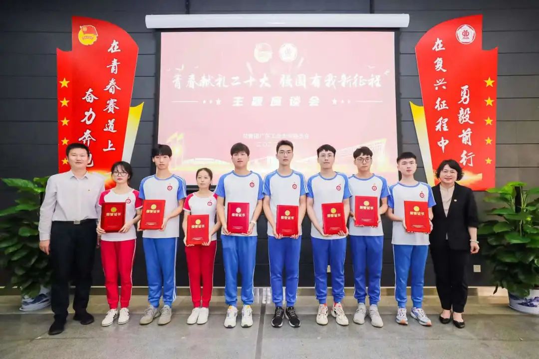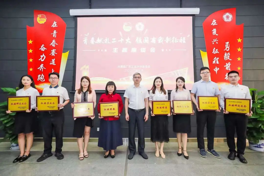 座谈会现场,学校领导为中国大学生自强之星,广东青年五四奖章(提名奖)、“两红两优”荣誉称号,学校“红旗团委”“红旗学生会”“红旗研究生会”和“十佳百优”荣誉称号获得者颁奖。