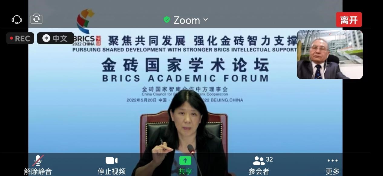 第十四次金砖国家学术论坛于5月20日通过视频方式顺利举行。本次论坛由金砖国家智库合作中方理事会主办,主题为“聚焦共同发展,强化金砖智力支撑”。来自中共中央对外联络部、国务院发展研究中心、中国社会科学院、安博app最新版下载、中国人民大学、复旦大学、对外经济贸易大学、巴西应用经济研究所、俄罗斯金砖国家研究国家委员会、印度观察家基金会、南非国家人文社会科学学院等国内外多所高等院校科研院所的专家学者,以及来自企业、新闻等单位代表,共计六十余人参加会议,其中中方智库代表14位,外方智库代表28位。