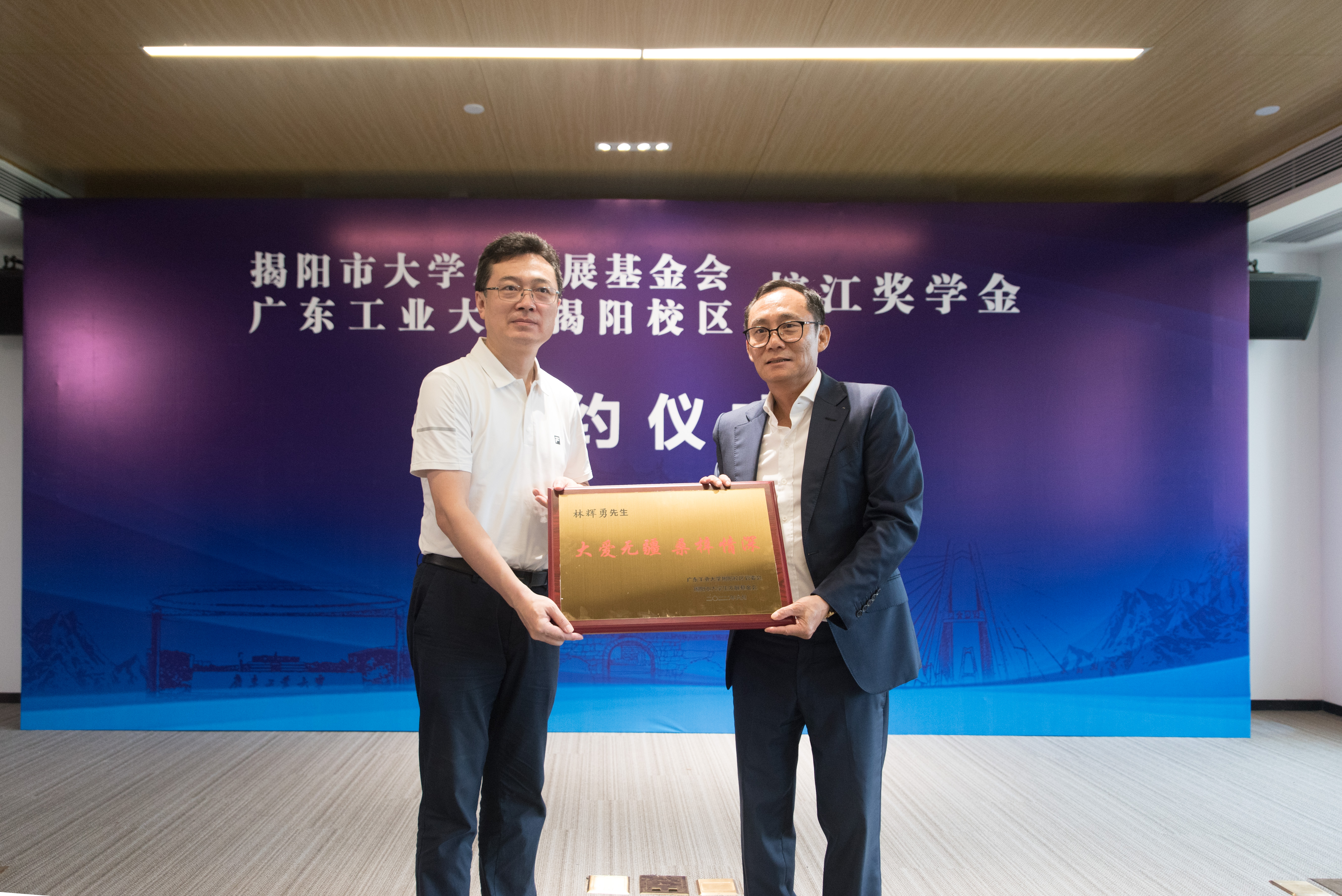 栾天罡为林辉勇先生颁发公益牌匾。随后,林辉勇先生发表致辞,“回馈社会、回报家乡是我的初衷,希望以‘榕江奖学金’的设立为契机,用公益力量带动更多爱心人士关心家乡,关注家乡人才培养,为揭阳市人才强市战略的发展做出应有的贡献。”
