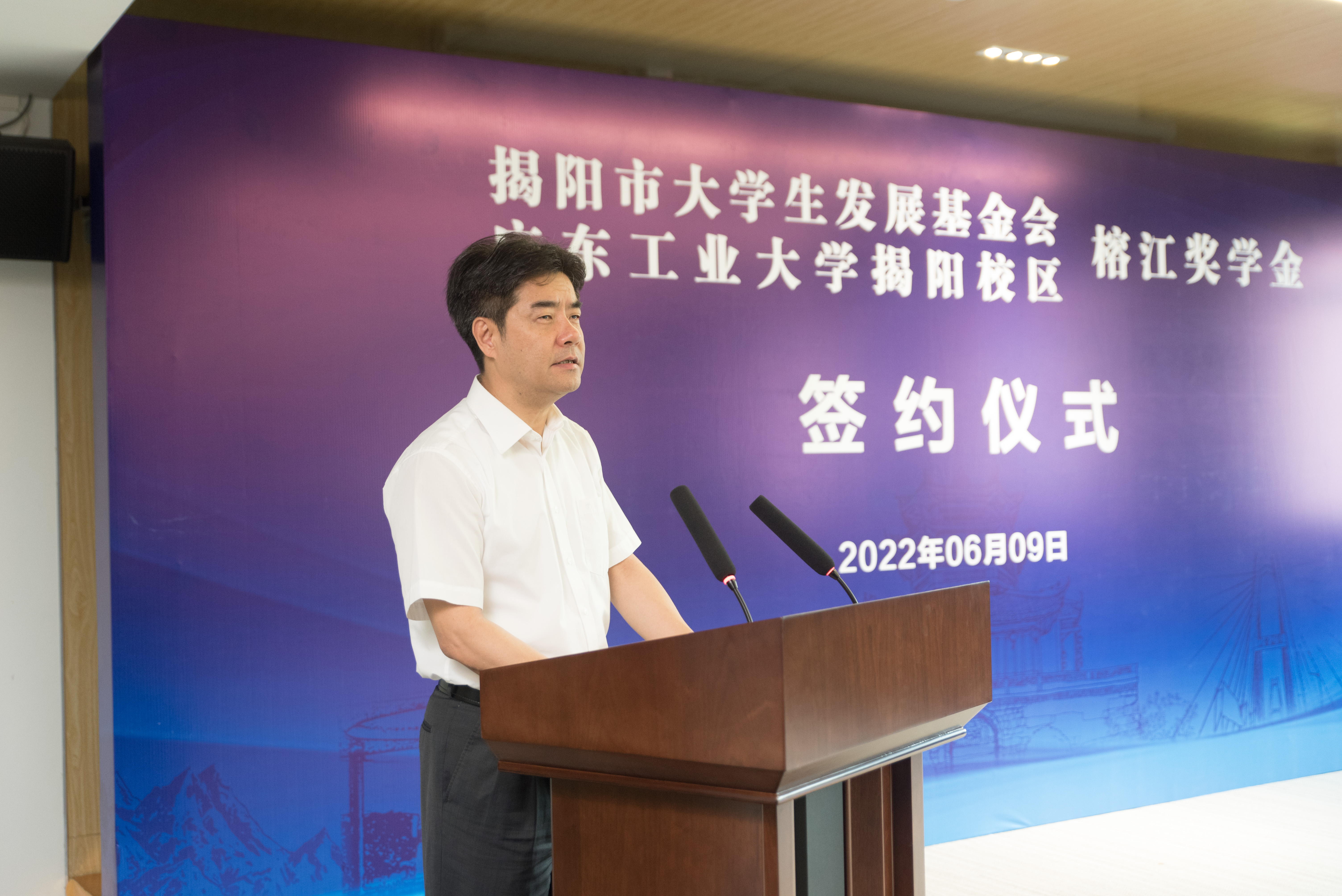胡钦太在讲话中强调,爱心企业家林辉勇先生是揭阳著名乡贤,在实现自身稳健发展的同时,林辉勇先生不忘家乡,桑梓情深,树立了揭阳乡贤助力家乡高等教育事业发展的标杆。“榕江奖学金”落地广工揭阳校区是广工学子之幸,是揭阳校区发展之幸,必将为揭阳高层次人才培养注入新动能。
