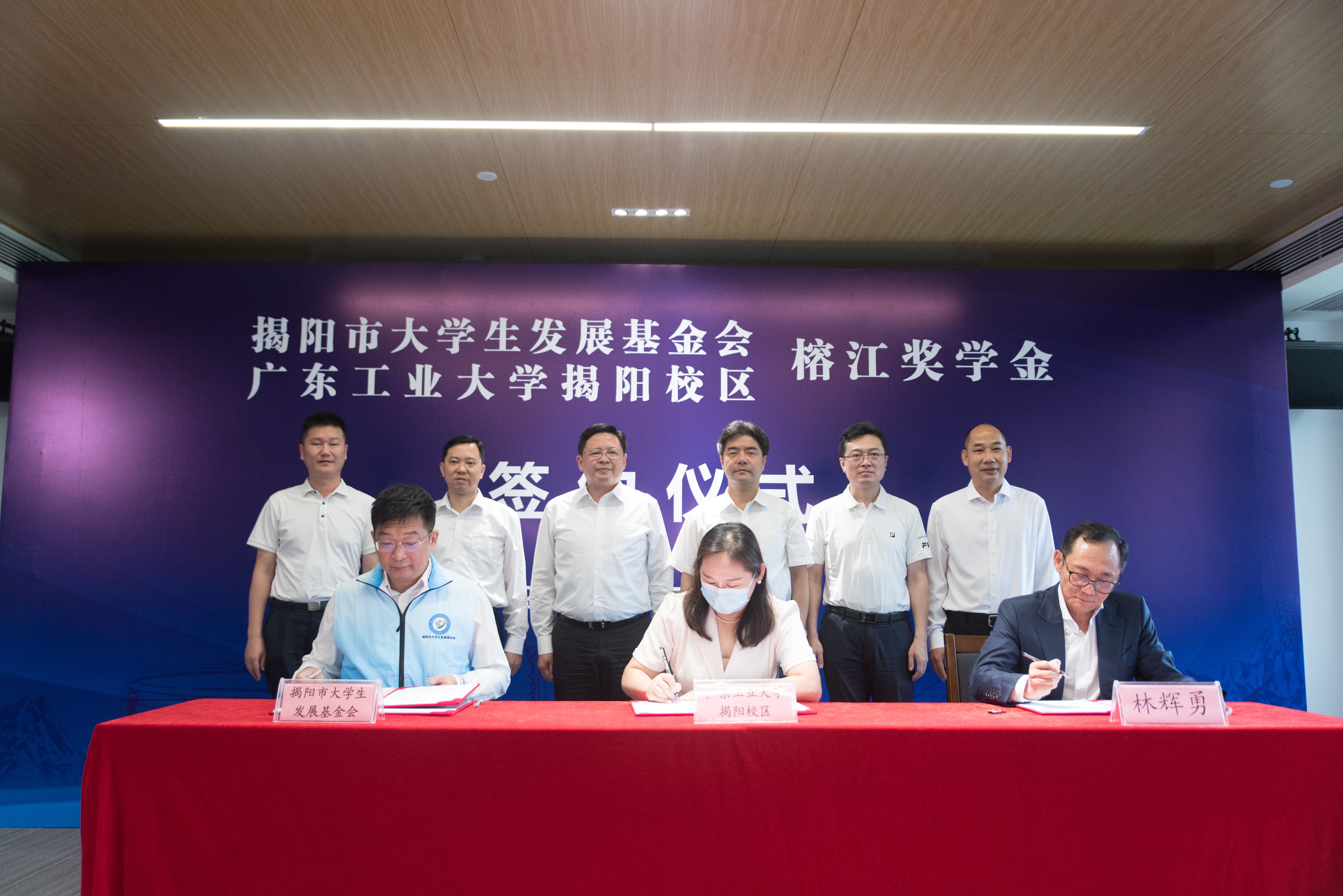 在与会嘉宾的共同见证下,林辉勇、宋旭彬、揭阳校区管委会常务副主任陈晖现场签订“榕江奖学金”协议。