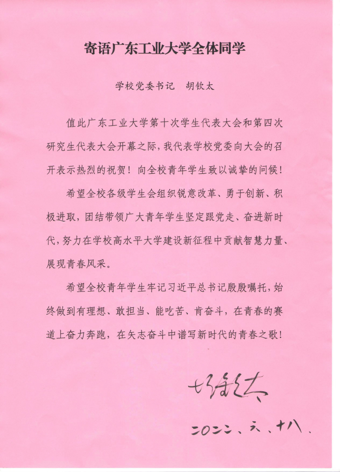 胡钦太寄语全体同学