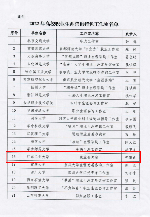 近日,教育部学生服务与素质发展中心公布2022年高校职业生涯咨询特色工作室建设名单,我校晓业咨询室被确定为2022年全国高校职业生涯咨询特色工作室。北京交通大学、首都师范大学等21所高校工作室获评,其中广东省有两所高校,我校为其中一所。