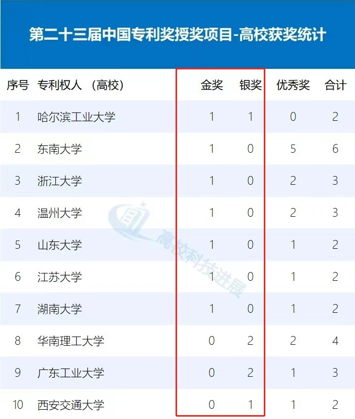 7月26日,国家知识产权局公布第二十三届中国专利奖授奖决定。广工两项发明专利获中国专利银奖,一项发明专利获中国专利优秀奖,金奖银奖获奖总数与哈尔滨工业大学、华南理工大学并列全国高校第一。这是广工首次实现中国专利银奖的突破,并实现同一届获得2项中国专利银奖,是广工在中国专利奖取得的历史最好成绩。