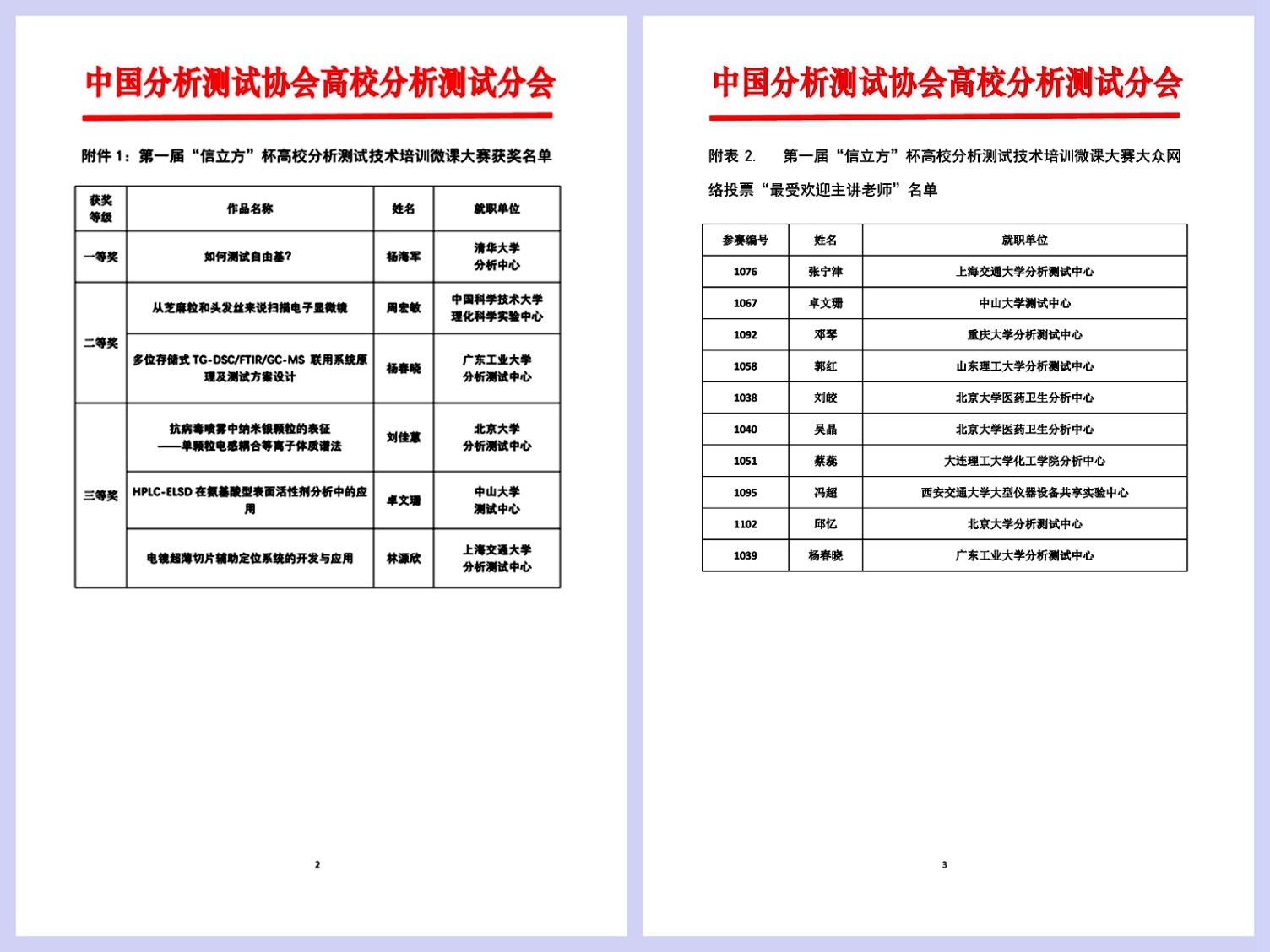 第一届“信立方杯”高校分析测试技术培训微课大赛由中国分析测试协会高校分析测试分会联合仪器信息网共同举办,旨在贯彻教育部启动的“教育数字化战略行动”,提升高校分析测试中心分析测试技术培训技能,有效支撑高校人才培训发展的需求。高校分析测试分会学术奖励评审委员会的专家学者从专业性、创新性、视频内容、视频呈现等四个方面,对申报的培训课程视频进行评审,经过形式审查、函评和会议评审,评选出一等奖1名、二等奖2名、 三等奖3名;同时,举行大众网络投票活动,评选出“最受欢迎主讲老师”10名;大赛获奖名单见下图。
