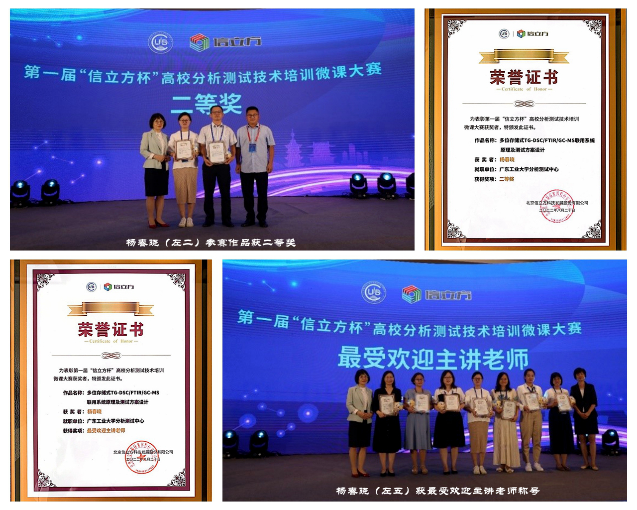 会议期间举办了第一届“信立方杯”高校分析测试技术培训微课大赛颁奖典礼,杨春晓的参赛作品《多位存储式TG-DSC/FTIR/GC-MS联用系统原理及测试方案设计》荣获大赛“二等奖”,并获“最受欢迎主讲老师”称号。
