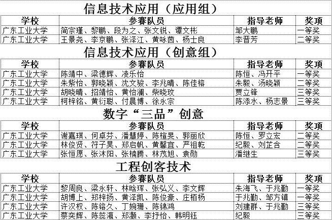 本届大赛包含信息技术应用赛项、数字“三品”创意赛项、工程创客技术赛项。校赛共征集来自各学院的学生作品30个,按照大赛组委要求,遴选推荐优秀作品参加广东省赛。经过专家线上评审,广东省赛获奖名单于10月31日公布,广工学子获一等奖4个,二等奖4个,三等奖5个。