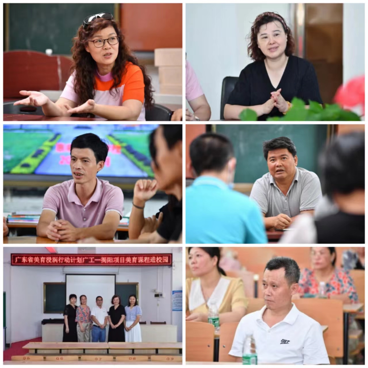 2022年初,广工和揭阳市教育局、惠来县教育局、揭西县教育局联动发起美育浸润行动计划新举措,让对接学校美育教师全员参与项目,在美育浸润过程中通过课堂教学、第二课堂、校园文化建设、作品展览或艺术展演四位一体的教学工作,明教改思路、出创意精品、美校园环境、制艺术品牌、成学校制度,完成项目,撰写研究报告。项目落地过程中,得到了教育局的大力支持,促进项目进展顺利。2022年9月23日至25日,惠来县方东升副局长、教研室张红兵副主任、艺术教研员蔡俊华、揭西县李文标副局长、教师发展中心教研室林少英主任、艺术教研员刘旭新、金和镇教育组长林卓彬、教育组专干杨少彬;灰寨镇教育组长杨双富、教育组专干李旭文等人参与美育浸润与项目推进工作。