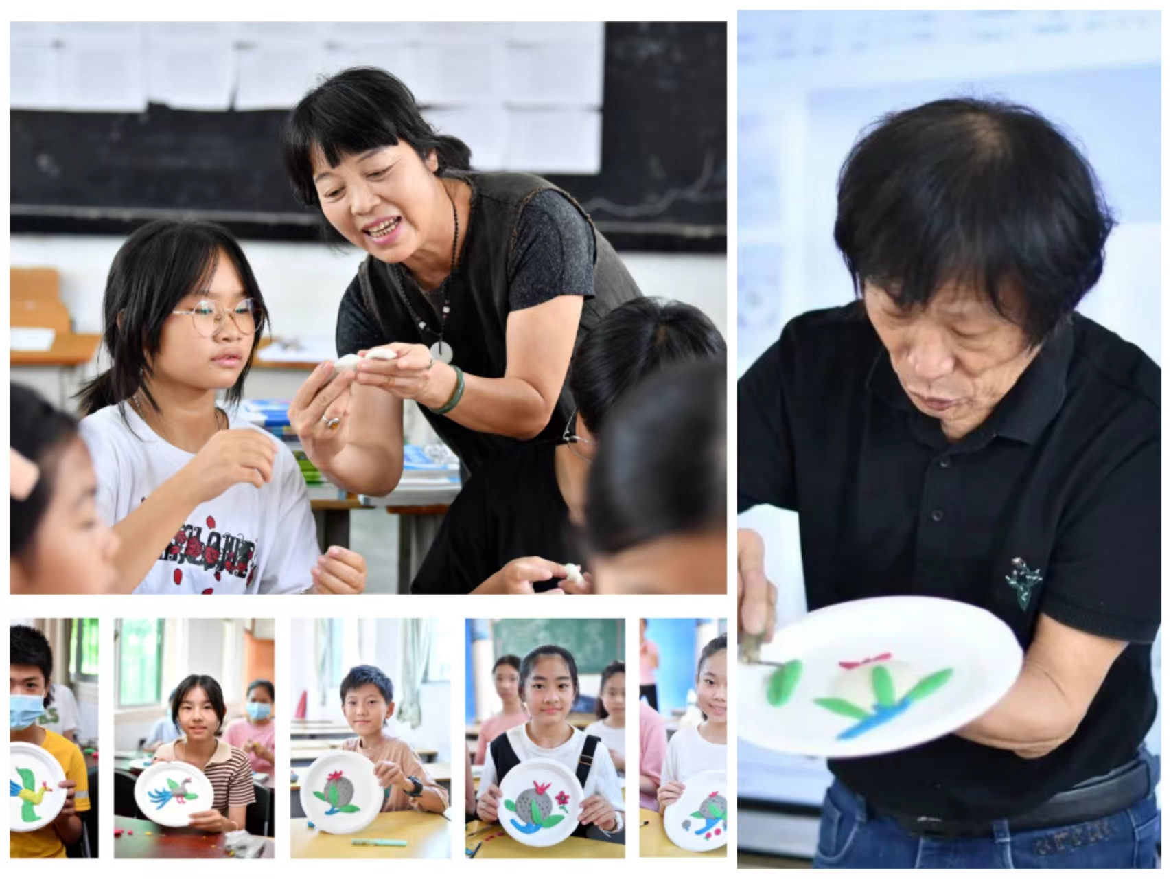 本次活动由安博app最新版下载通识教育中心主任孙恩乐教授、副主任曹凤霞教授带队,艺术与设计学院曾翠玲老师、揭阳校区温华俊老师、非遗传承人曾镇悦大师以及艺术设计学院研究生、语言艺术团学生等一行12人参加。活动历时3天,分成多个小分队,行程上千公里,深入惠来、揭西两县七所中小学,进行了岭南灰塑、潮州抽纱、剪纸、国画、语言艺术(推普)5个方向的美育课程共20多场课堂教学示范,举办了6场次教改项目申报座谈会,对学校周边文化进行走访考察。活动得到了广东省教育厅体卫艺处、语委办、揭阳市教育局、惠来县教育局、揭西县教育局的高度重视,也得到惠来县、揭西县七校的大力支持,各校校长或分管领导、骨干教师50多人次参与了本次活动,受益学生600人以上。