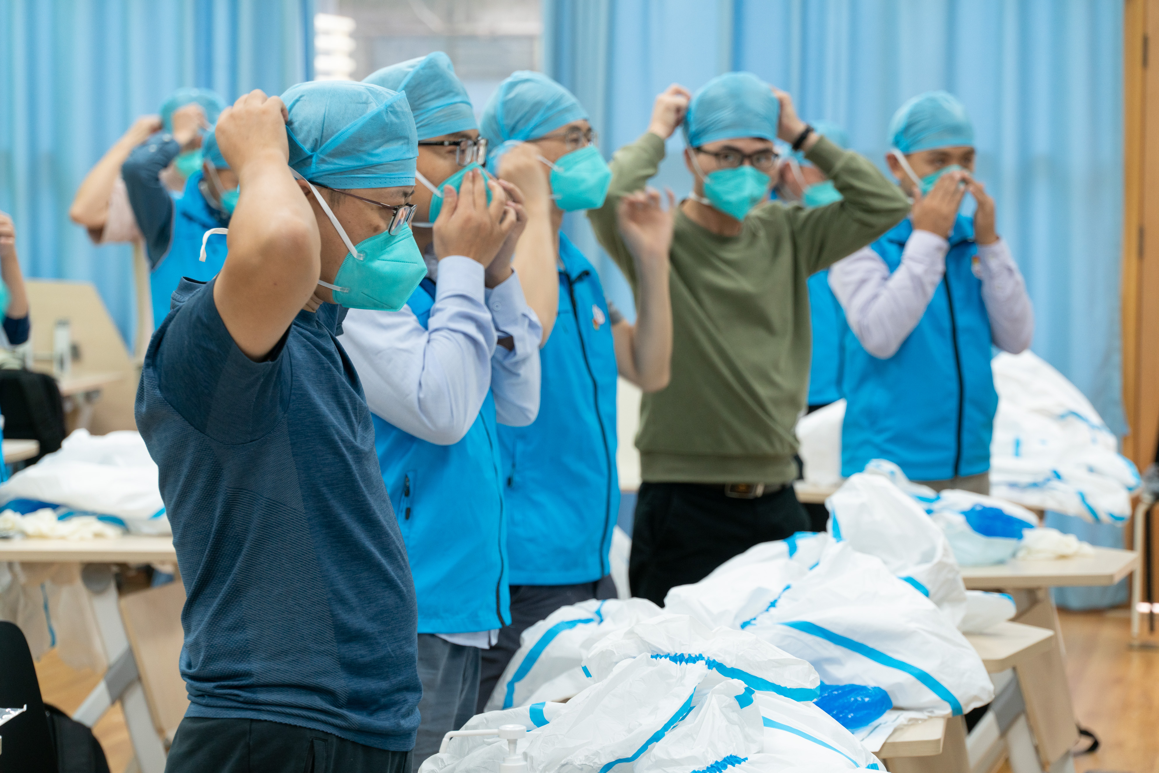 N95口罩、面屏、防护服、靴套、外科手套、一次性帽子、消毒液……中午12时,突击队队员认真地学习面前每一样核酸采集物资的正确使用方法。“在开展核酸检测前,一定要修剪指甲,头发也要扎起来,注意千万不要用手去碰口罩。”“学习穿防护服很重要,但是脱防护服更重要,因为这个时候防护服已经被污染了。”医护人员现场耐心教授,带领队员们从每一个细节进行练习,力争每一个动作规范到位。经过现场考核,全部合格,正式上岗。近5个小时的时间,队员们从生疏到娴熟,协助专业人员完成了30812名广工师生员工核酸采样工作。