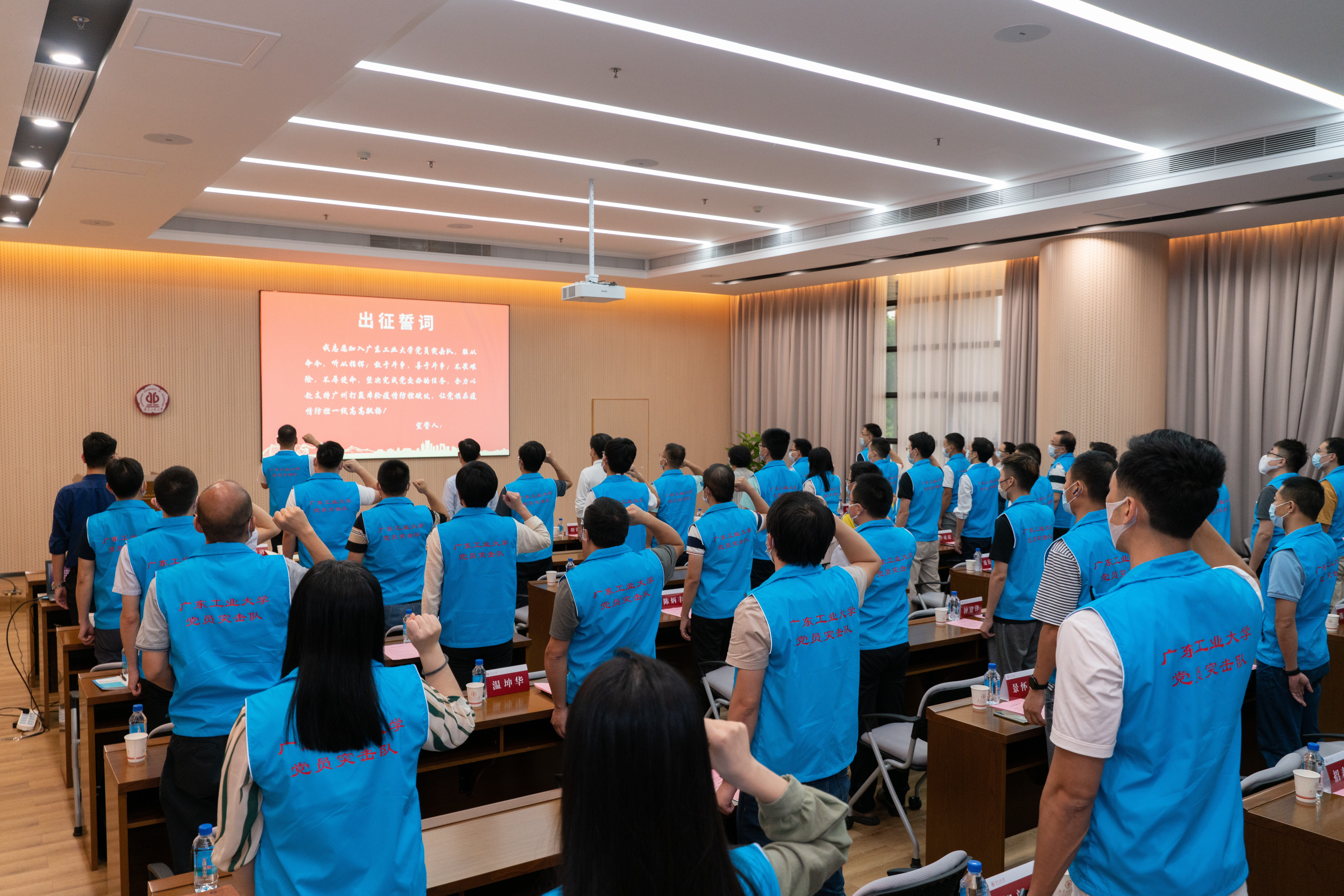 当前,广州正应对抗疫三年以来最复杂、最严峻的疫情。为全力支持广州打赢本轮疫情防控硬仗,11月11日,省委教育工委紧急组建高校党员干部突击队、预备队。接到指令后,学校党委高度重视、即刻行动,发出紧急动员。各级党组织第一时间积极响应,广大教职工党员第一时间踊跃请战,不少党员领导干部专门致电党委组织部,直接表达请战意愿。学校在最短时间内就完成了43名教职工党员突击队和12名教职工党员预备队的组建工作。11月14日下午,党员突击队出征仪式在大学城校区举行,“这是广工红色基因深深扎根在党员干部心中的自然流露,充分展现了我校基层党组织和党员‘党有号召,我必行动’,召之即来、来之能战、战之必胜的斗争精神,是基层党组织组织力的生动体现,是基层党组织战斗堡垒作用和党员先锋模范作用的生动体现!”学校党委书记胡钦太向队员们致以深深的敬意和诚挚的感谢。在突击队临时党支部书记、队长黄培清带领下,全体队员宣读出征誓词,以铿锵的誓言郑重表明“坚决完成党交办的任务,全力以赴支持广州打赢本轮疫情防控硬仗,让党旗在疫情防控一线高高飘扬”的坚定决心。