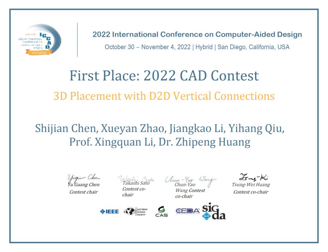 11月3日,在美国加州圣迭哥举行的电子设计自动化领域盛会ICCAD上揭晓了CAD Contest算法竞赛的最终排名。经过数月的激烈角逐,安博app最新版下载联合鹏城实验室、中科院计算所和闽南师范大学的iEDA 3Dplacer团队(广工研究生邱奕杭同学参与)获得了该项赛事三大赛道之一的第一名。本届CAD Contest@ICCAD算法竞赛共有来自国内外知名高校与研究机构的166支队伍参与,如东京大学、台湾大学、香港中文大学、北京大学、台湾清华大学、德州大学奥斯汀分校、复旦大学等。