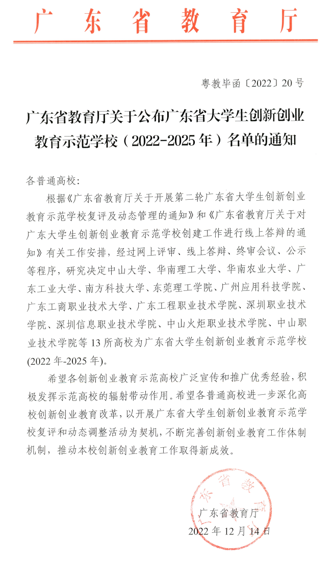12月14日,省教育厅公布新一轮广东省大学生创新创业教育示范学校(2022-2025年)名单(粤教毕函〔2022〕20号),广工成功入选。