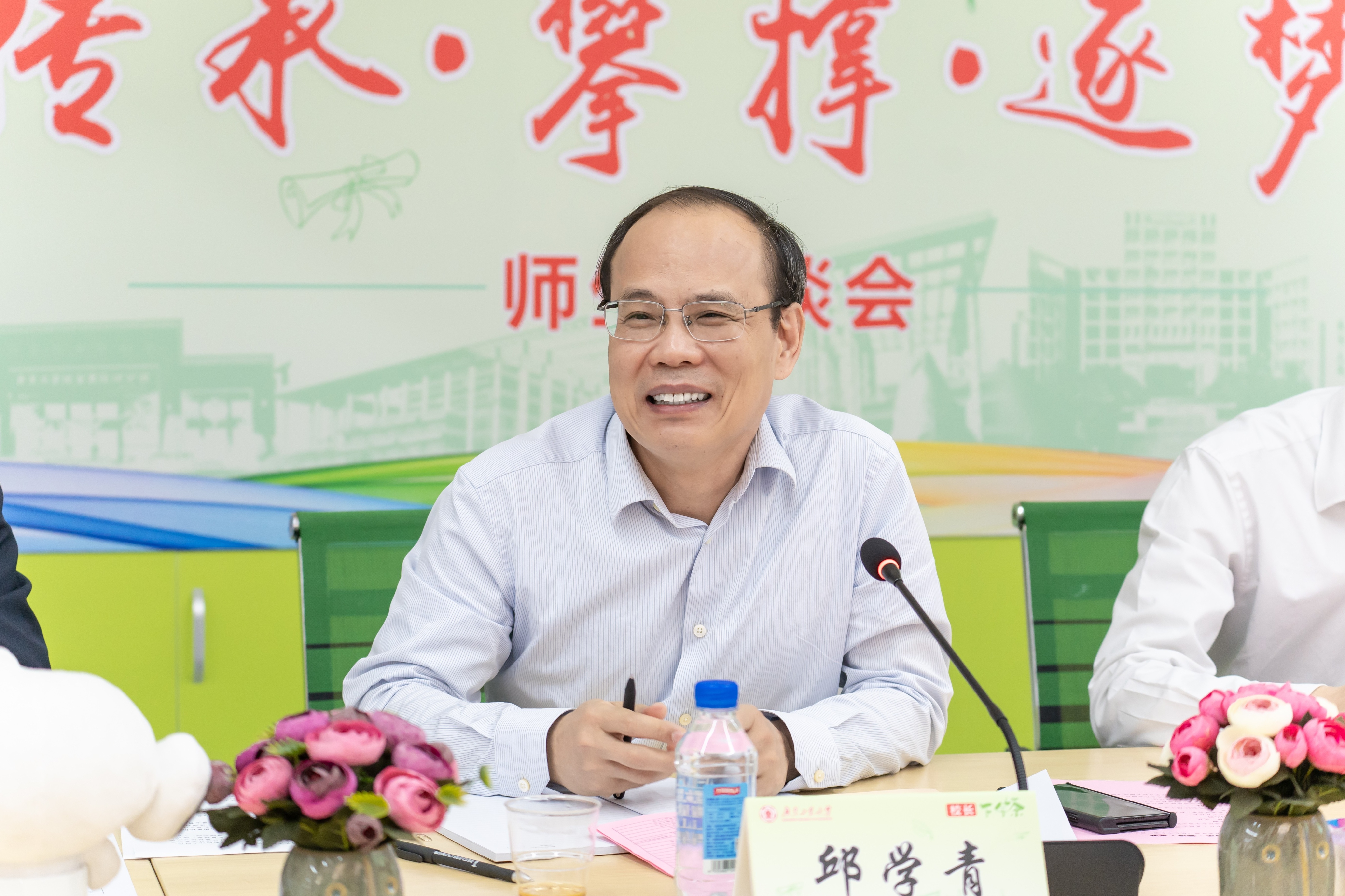 邱学青认真听取同学们的发言,不时提问、认真记录、热情回应。他充分肯定同学们大学期间在磨炼意志、学业科研、创新创业、文体实践等方面付出的努力,为同学们取得的成绩感到高兴与欣慰。他结合学校正全力推进的“1+2+3”攀撑计划学科提升工程,与同学们分享了自己对于“攀撑”的理解和认识,希望同学们始终发扬“攀撑”精神,做到撑天拄地、勇攀高峰,演绎更多“攀撑”故事,实现更大的人生价值。他寄语:一是要坚持终生学习。要善于向身边人学习,将学习作为自己一生的课题,还要善于思考,做到学思结合、学以致用,培养独立思考与批判性思维能力。二是要勇担社会责任。用自己的聪明才智与专业本领为社会发展作出应有贡献,争做堪当时代重任的社会主义建设者和接班人,积极传播正能量,展现广工学子向上向善的优秀品质。三是要学会做人。要坚持修身力行,不断完善自己,感恩父母的养育,感念母校的培养。要心系学校建设发展,常回母校看看,增进爱校荣校情感,以实际行动为学校增光添彩。四是要加强体育锻炼。良好的运动习惯终身受用,要始终保持健康向上的身心状态,勇往直前迎接未来的各种挑战。