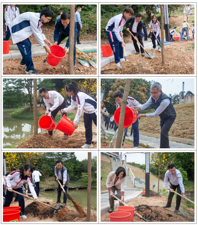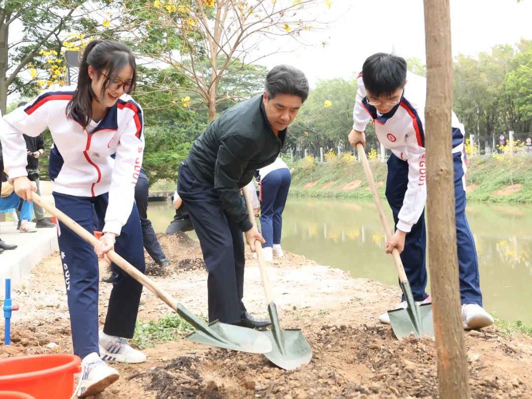 山黛满目,春生万物。3月13日下午,学校在大学城校区生活西区河涌两岸开展了“喜迎校庆,捐植树木,美化校园”植树活动。学校党委书记胡钦太,党委副书记、校长邱学青,党委副书记陈良友,党委常委、副校长杜承铭,党委常委、副校长陈卓武,党委常委、副校长栾天罡,副校长余林,党委常委、副校级干部张学理,各相关单位、部门负责人,大学城校区各学院师生代表、学生志愿者等,分别组成27个植树小组为校园增添新绿。