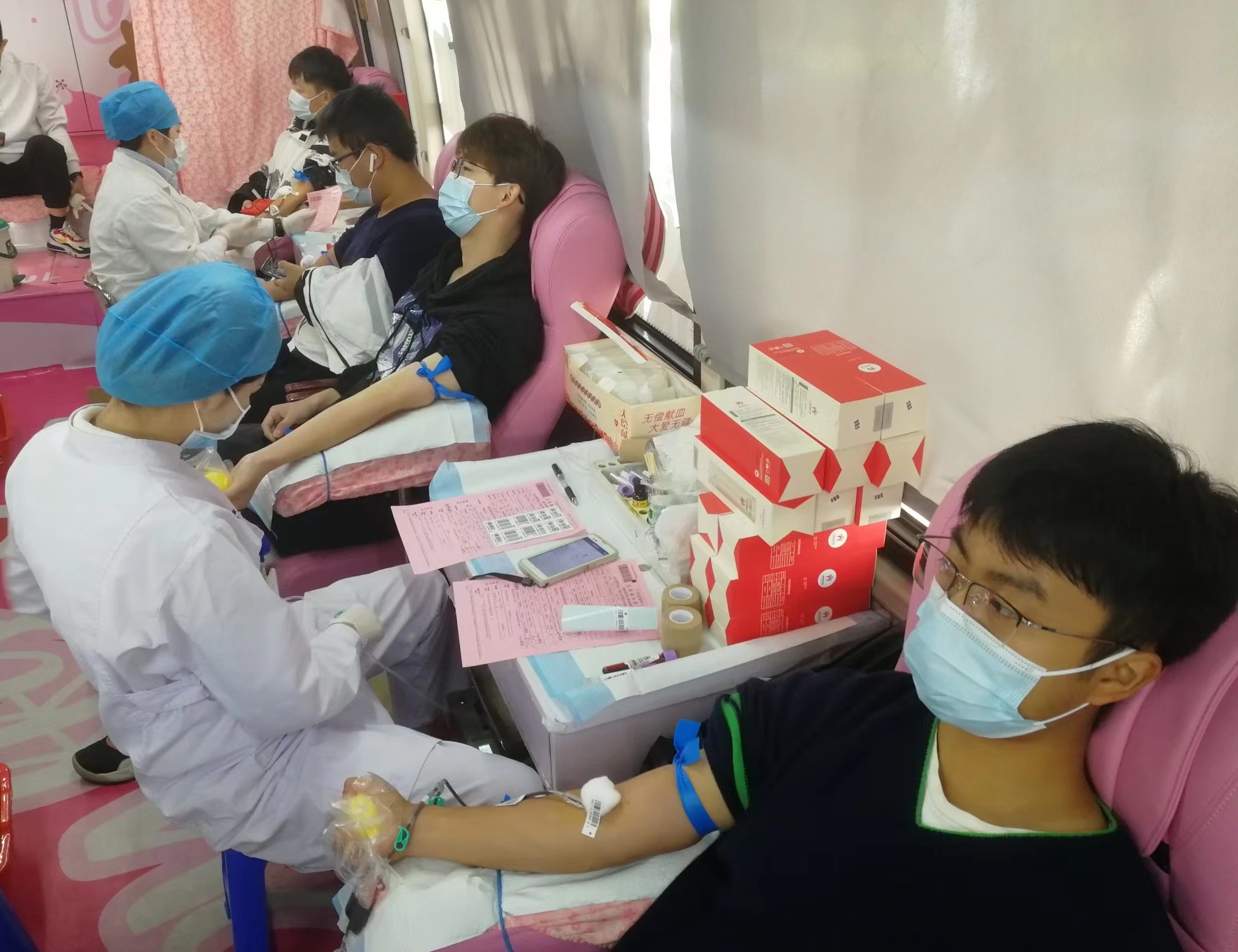 同学们在医生的帮助下进行献血