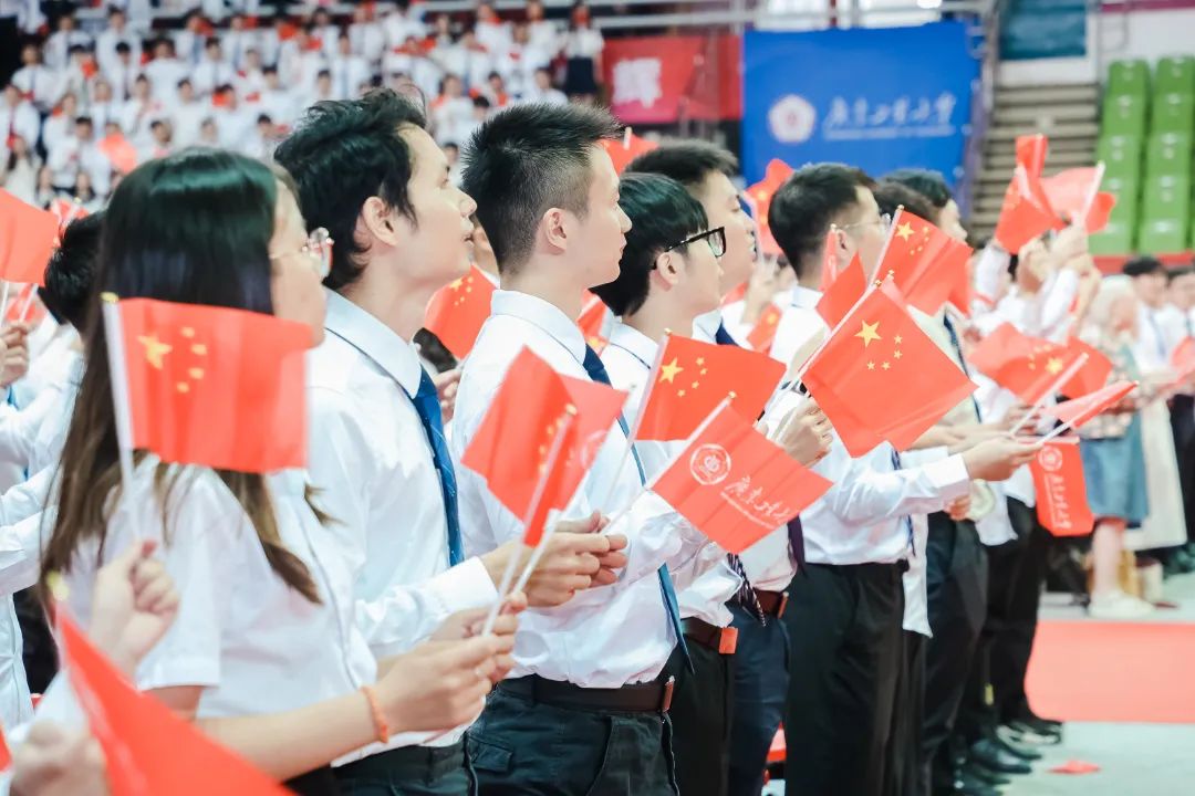 仪式上,毕业生们带着母校的期望、师友的祝福,由投身不同就业领域的优秀代表组成的“基层就业服务团”“大国工匠接班人”“科研创新攀撑者”登台,接受学校党委书记胡钦太授旗,出征奔赴梦想大舞台。