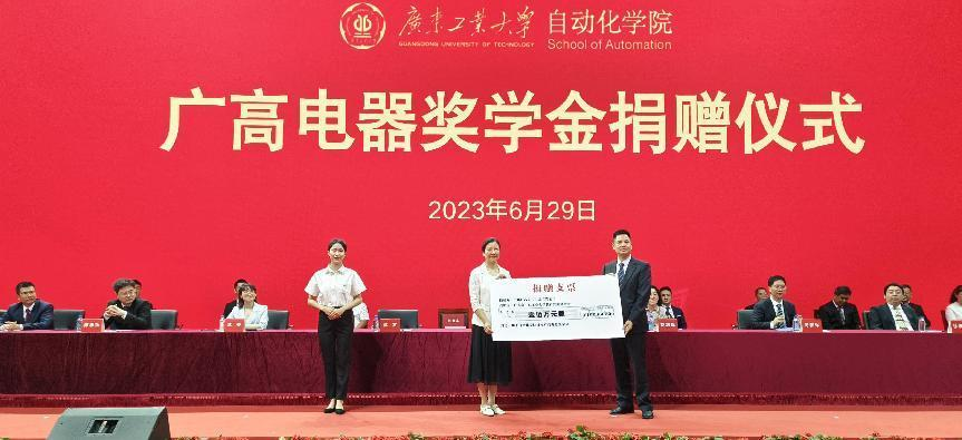 6月29日上午,“广高电器奖学金捐赠仪式”在学校自动化学院2023届毕业典礼上举行。学校党委副书记朱蔚蔚,广高电器董事长、黄埔校友会轮值会长刘贤龙,广高电器总裁、白云校友会执行会长刘贤文出席仪式。