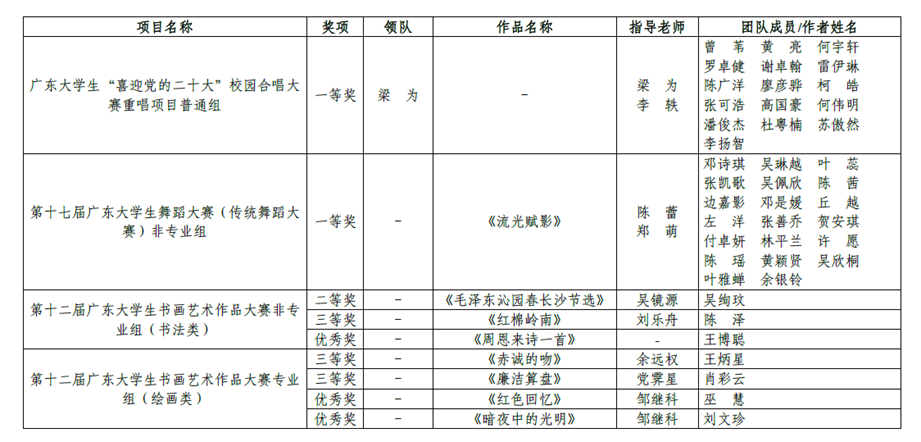 近日,从团省委、省委网信办、省教育厅、省体育局、省学联公布的《关于公布第十七届广东大学生校园文体艺术季活动获奖名单的通知》中获悉,广工师生共获得一等奖2项,二等奖1项,三等奖4项,优秀奖4项(具体名单见下表)。