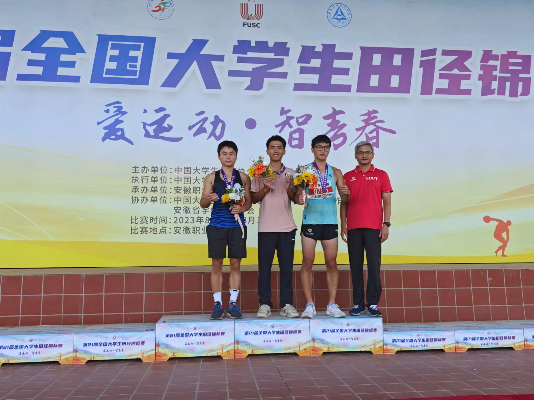 8月10日至15日,由中国大学生体育协会、中国田径协会主办的第21届全国大学生田径锦标赛(简称“大田赛”)在安徽职业技术学院举行。本届大田赛共有390所高校3550余名运动员参赛,是办赛以来规模最大、竞技水平最高的一次赛事。本届大田赛学校田径队共派出10名运动员、4名教练员出战,取得了1金1银2铜3个殿军,甲组男子团体总分第二名,甲组男女团体总分第三名的佳绩,同时突破学校甲组团体总分历史最好成绩。