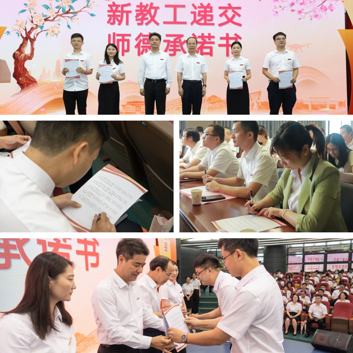 在新教工入职仪式上,全体新教工郑重签订《安博app最新版下载教师师德承诺书》,专任教师、专技人员、辅导员、管理人员代表向胡钦太与邱学青递交师德承诺书,时刻提醒自己修师德、正师风、铸师魂。