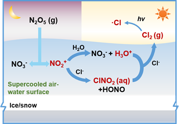 近年来关于对流层大气氯化学的研究发现,氯自由基具有极强的氧化性,能够快速氧化对流层中碳氢类有机污染物,从而影响大气中羟基自由基、过氧自由基和烷氧自由基的浓度,因此与对流层臭氧污染的发生密切相关,最终对对流层的大气氧化性、冬季二次污染物生成和人类生态系统的健康保护均具有重要影响。ClNO2是氯自由基和活性氮化物的重要来源,因此会影响大气的氧化性,并在全球氮循环和氯循环中起到重要作用。在寒冷地区,ClNO2主要来源于五氧化二氮(N2O5)在含氯冰/雪表面的非均相反应。因此,中美两国科学家结合多种理论化学算法,研究了ClNO2在过冷气-液界面的微观动力学转化过程及其对 氯自由基的形成贡献机制,揭示了ClNO2与氯离子在酸化后的气-液界面的非均相化学反应机理,提出了N2O5水解产生的酸性离子是其快速产生活性氯的先决条件。该成果不仅有助于正确理解寒冷地区大气氯自由基的来源,更可以为大气氯化学反应对对流层大气氧化性、二次污染物形成和臭氧产生的贡献提供基础数据。