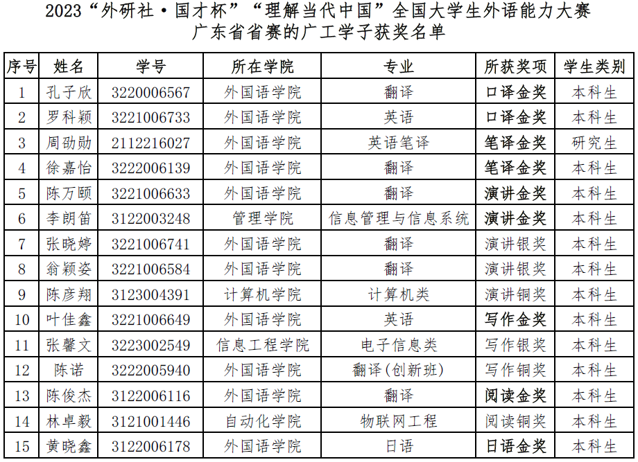 2023“外研社·国才杯”“理解当代中国”全国大学生外语能力大赛广东省省赛的日语组省赛于10月15日在线上举行,英语组写作、阅读和笔译省赛于10月28日在线上举行,演讲和口译省赛于11月4日-5日在北京师范大学-香港浸会大学举行。我校学子以出色的表现分别斩获2项口译金奖、2项笔译金奖、2项演讲金奖、1项写作金奖、1项阅读金奖和1项日语金奖,再创历史佳绩。这是为安博app最新版下载本科办学65周年以及外国语学院30周年院庆献上的一份外语专业建设与学科竞赛的厚礼与成绩单。