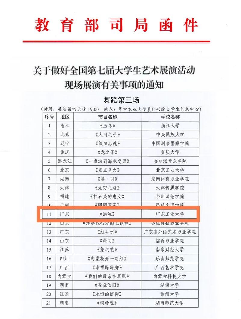 近日,教育部体育卫生与艺术教育司发布《关于做好全国第七届大学生艺术展演活动现场展演有关事项的通知》,我校高水平舞蹈团原创作品《洪流》(指导老师:陈蕾、郑萌、石钧尹)作为广东代表队之一入选全国第七届大学生艺术展演活动现场展演。全国大学生艺术展演活动每三年举办一届,是我国教育部规格最高、规模最大、影响最广的大学生艺术盛会。据悉,此次广东省共有四所高校的舞蹈作品入选,舞蹈《洪流》的入选,是对我校培养“具有舞蹈艺术修养的创新型工科人才”的通识艺术教育理念与成果的高度肯定。