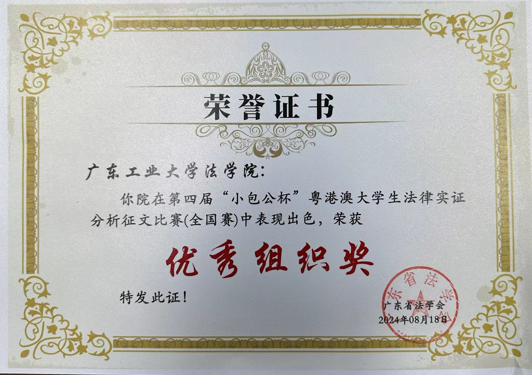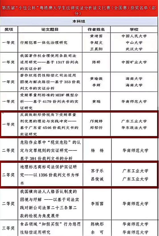 近日,广东省法学会开展第四届“小包公杯”粤港澳大学生法律实证分析征文比赛(全国赛)。学校法学院积极组织、悉心指导学生参加比赛,被授予优秀组织奖(全国共10个)。法学院邝婉婷同学的《反腐败新形势视角下受贿罪量刑优惠的理论与实践冲突——基于广东省4546份裁判文书的实证研究》从全国600余篇论文中脱颖而出,获得本科组论文一等奖,苏子乐、吕俊诚同学的《地理标志商标司法保护实证研究——以1396份裁判文书为样本》获得本科组论文二等奖,在获奖名次和数量上取得这一赛事的新突破。