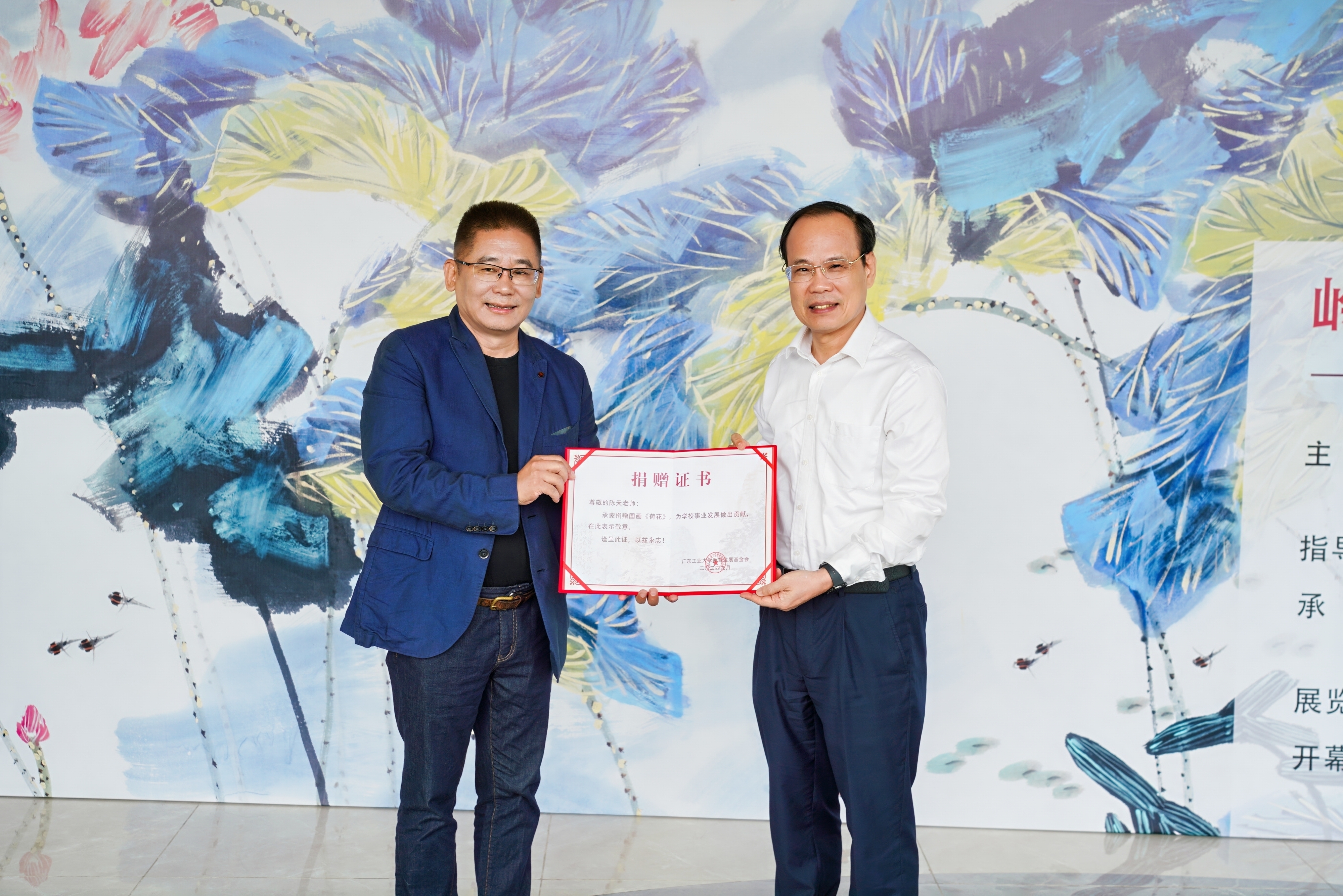 开幕式上,邱学青代表学校接受了陈天捐赠的画作《荷花》并颁发捐赠证书。画作中莲叶碧绿接天连地、荷花怒放亭亭玉立,表达了对祖国繁荣昌盛、欣欣向荣的美好祝福。