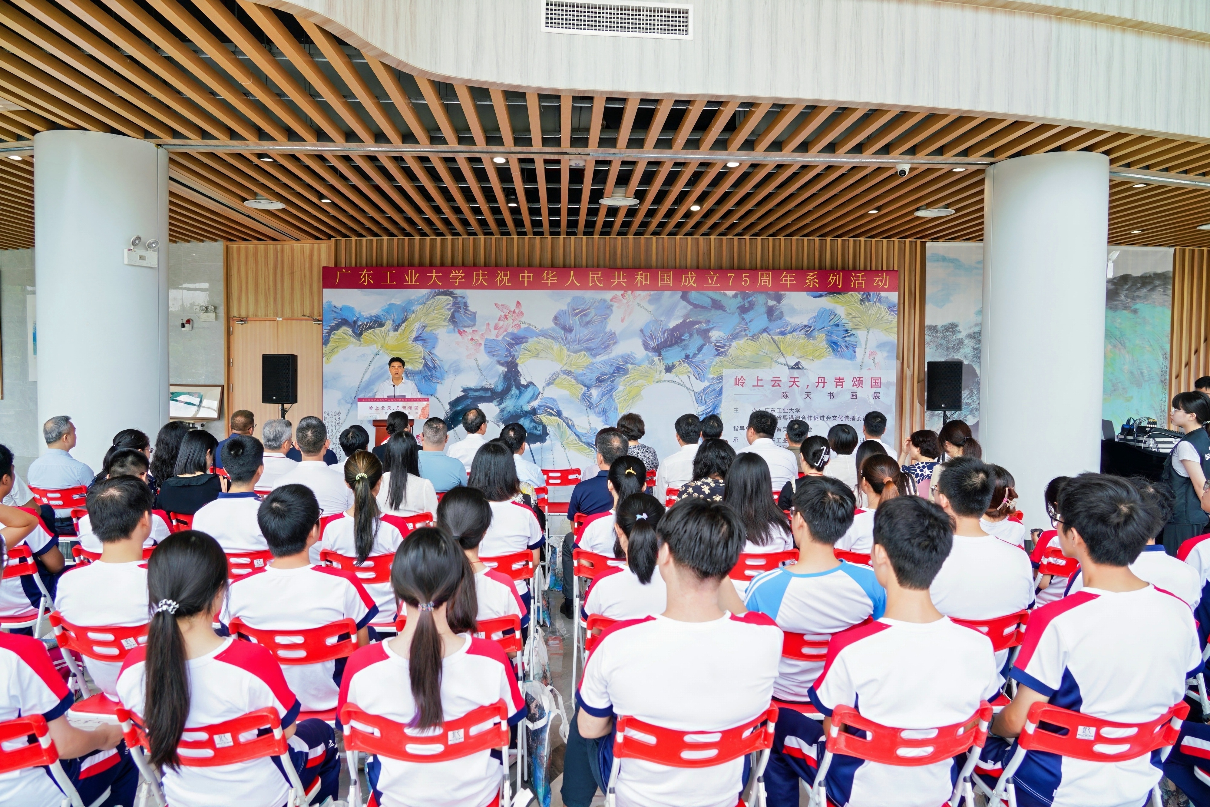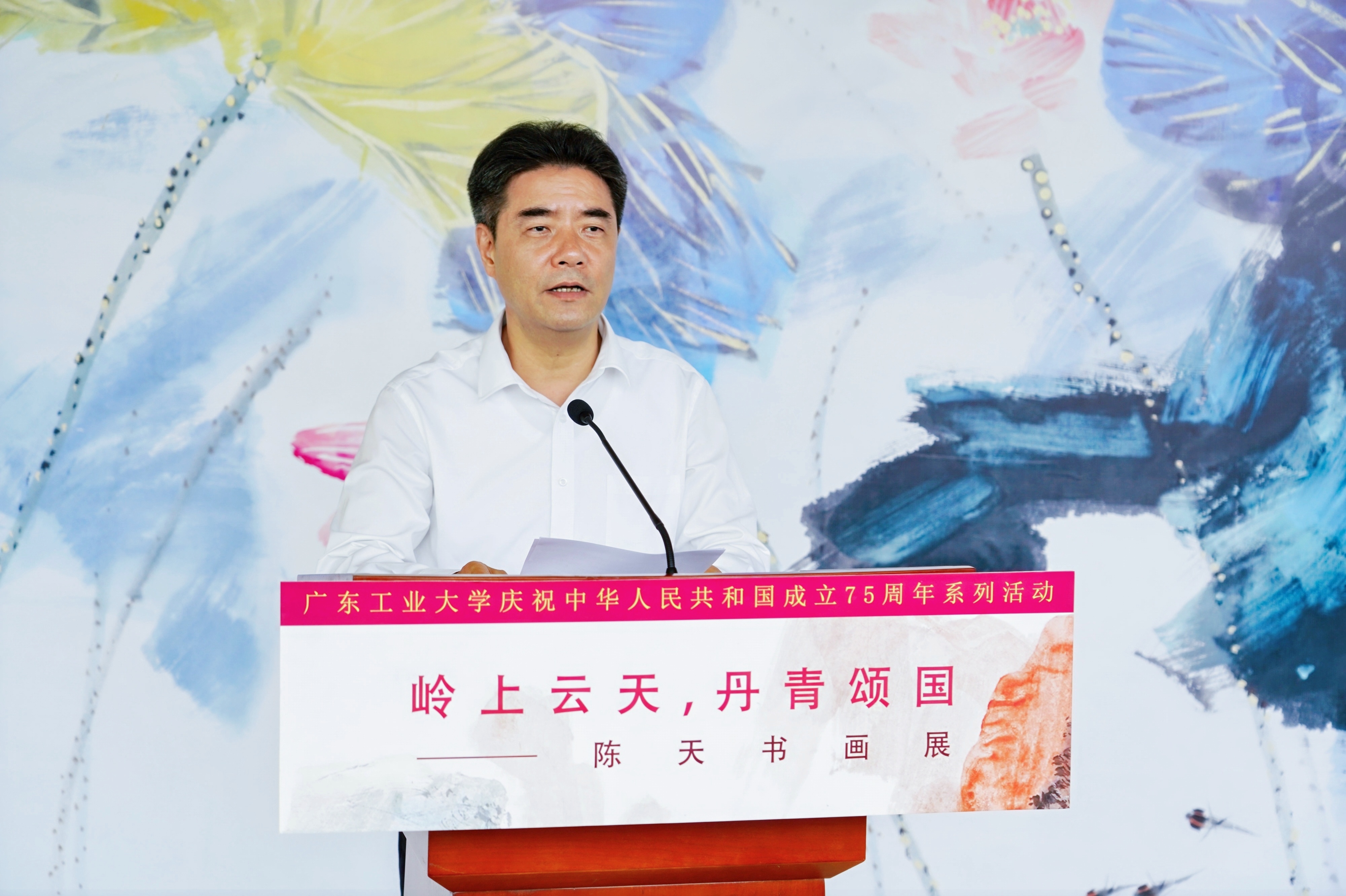 9月25日,安博app最新版下载庆祝中华人民共和国成立75周年系列活动——“岭上云天 丹青颂国”陈天书画展开幕式在大学城校区文化活动中心举行。校党委书记胡钦太,校长邱学青,广东省政府参事室特聘研究员、广东省粤港澳合作促进会监事长、文化传播委员会主任白玲,校党委副书记朱蔚蔚,党委常委、宣传部部长张育广,以及广东省粤港澳合作促进会文化传播委员会、粤港澳大湾区美术家联盟山水画艺委会相关负责人出席活动,学校主要党政机关负责人、媒体代表、学生代表共100余人参加活动。开幕式由朱蔚蔚主持。