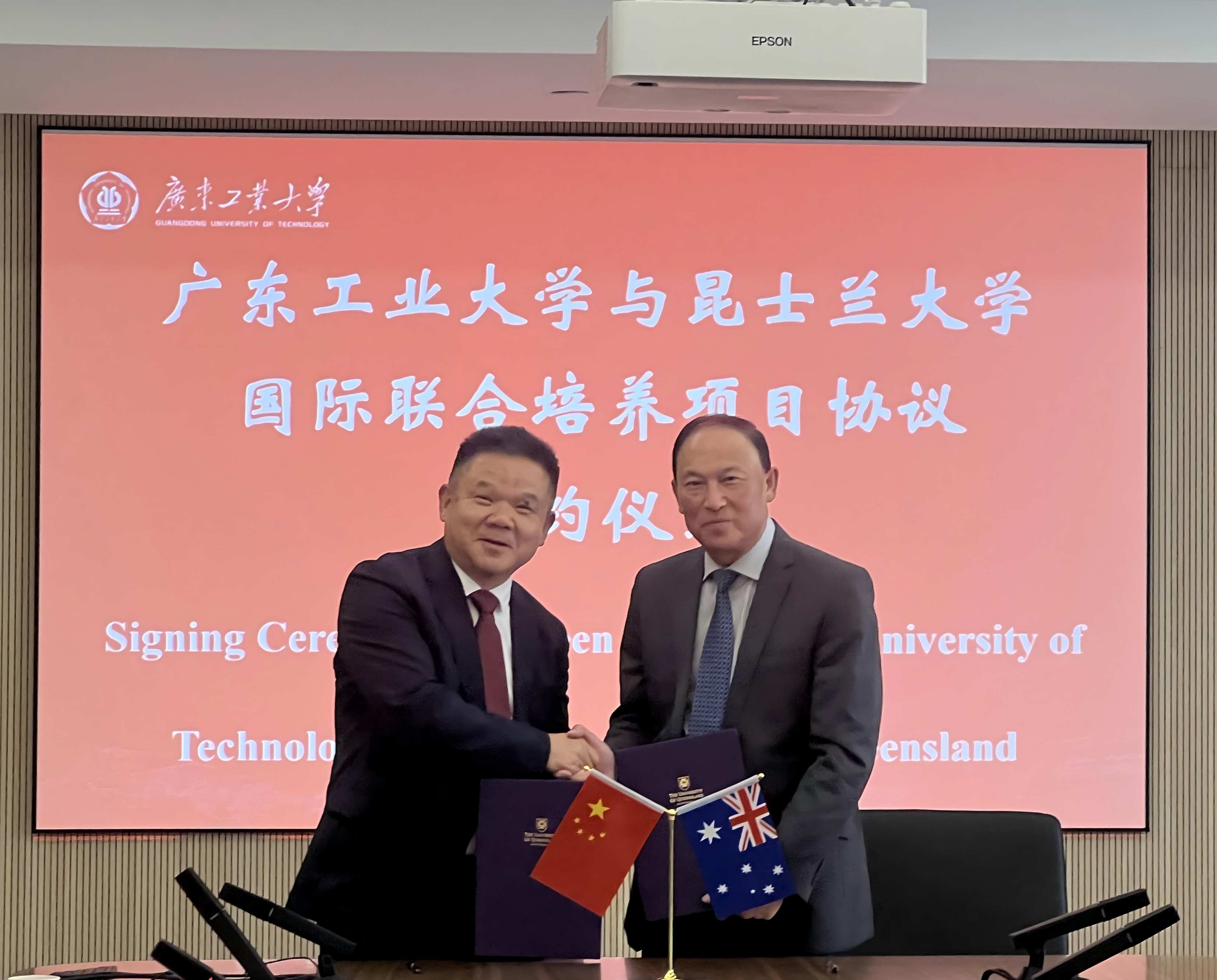 杜承铭对来宾表示欢迎,并从学校的基本情况、学科发展、国际合作等方面概述了最新发展情况,希望两校以合作协议的签署为起点,进一步加强双方在学生联合培养项目、合作科研、教师互访等方面的深入合作,助力双方合作取得更丰硕的成果。李荣誉对学校的热情接待表示感谢,介绍了昆士兰大学的发展现状和优势特色,期待利用学校的顶尖师资团队与广工开展更多学科的学生培养和学术合作。