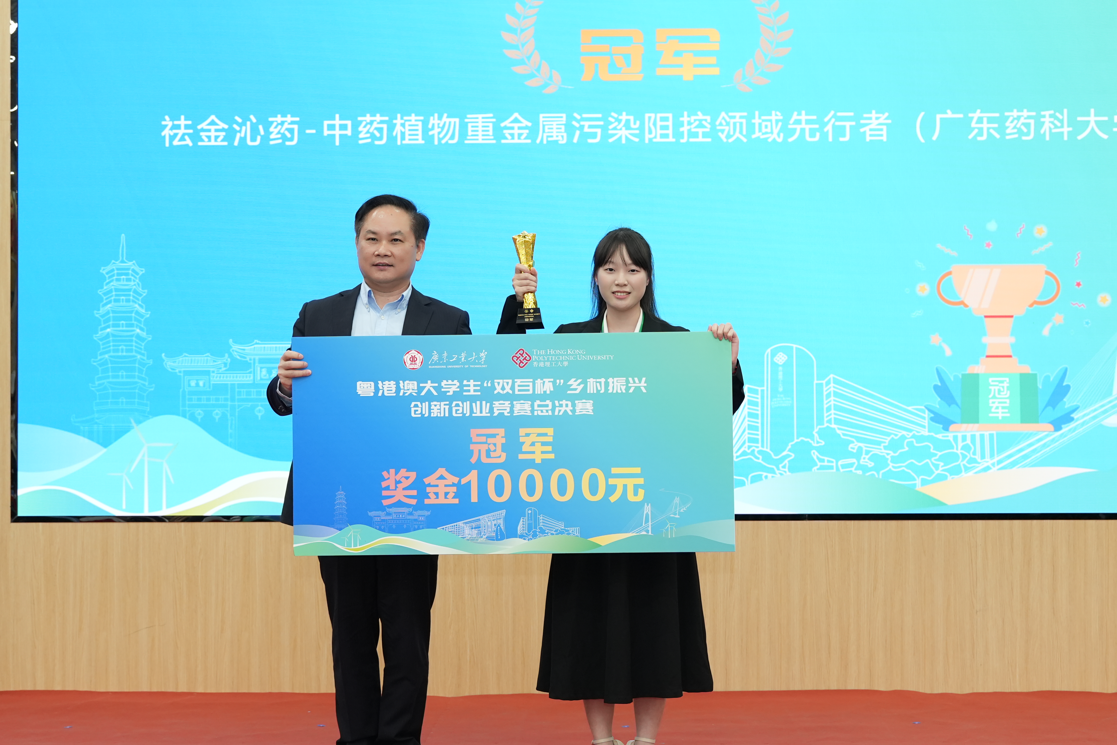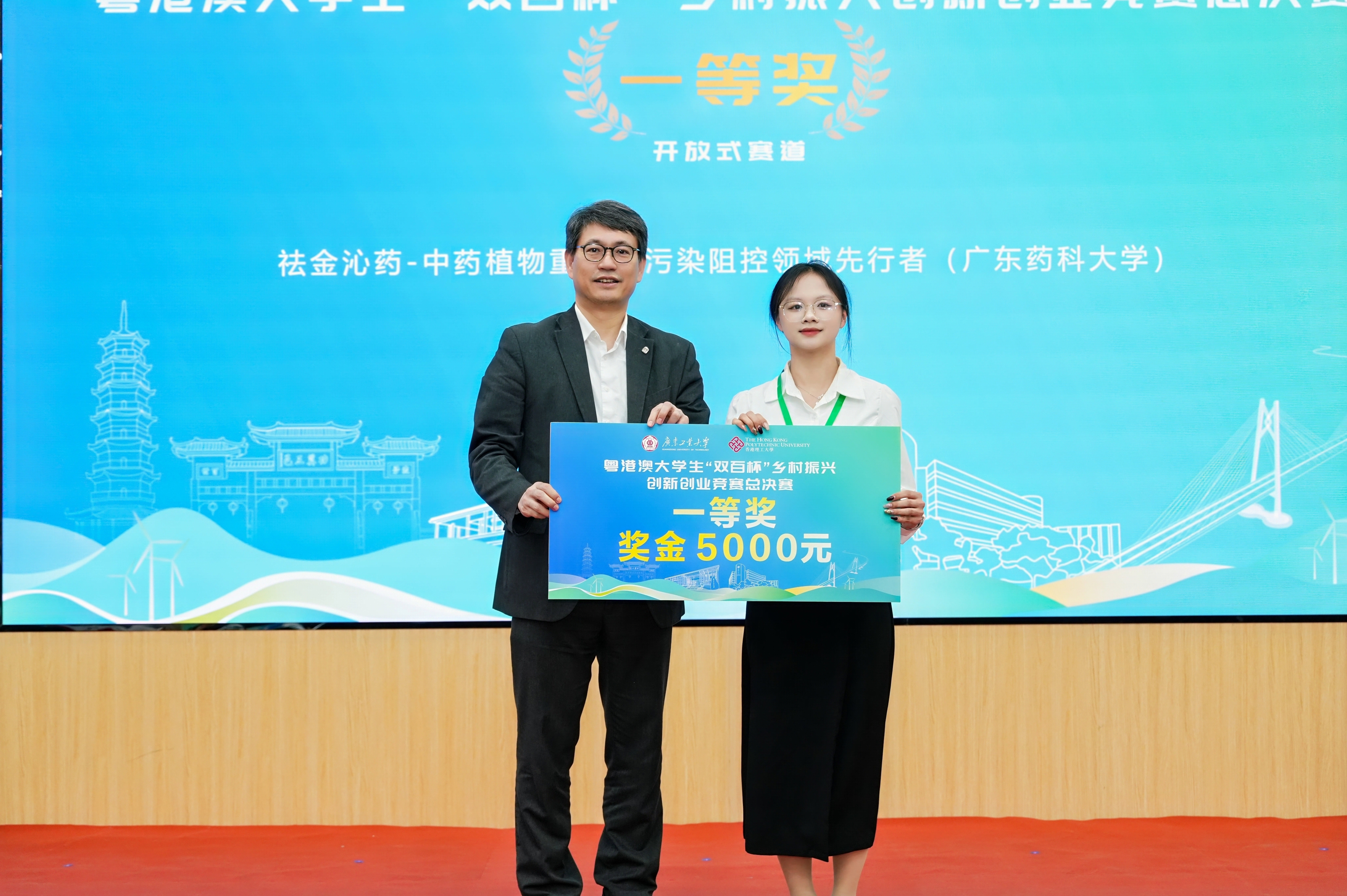 省委统战部副部长黄育振、省教育厅副厅长程大欣、香港理工大学副校长赵汝恒、广东技术师范大学校长戴青云、安博app最新版下载党委副书记陈良友、安博app最新版下载副校长余林、汕头大学纪委书记冯兴雷、广东药科大学副校长杨全、岭南师范学院副校长金义富、珠海科技学院副校长黄学寿等参赛高校领导出席颁奖仪式。省委统战部知工处、省教育厅就业创业处、广州大学城管委会、河源市东源县、云浮市郁南县等相关单位负责人以及香港岭南大学、澳门城市大学、广东轻工职业技术大学等粤港澳参赛高校相关部门负责人以及带队老师、参赛团队学生代表等150余人参加仪式。仪式由余林主持。