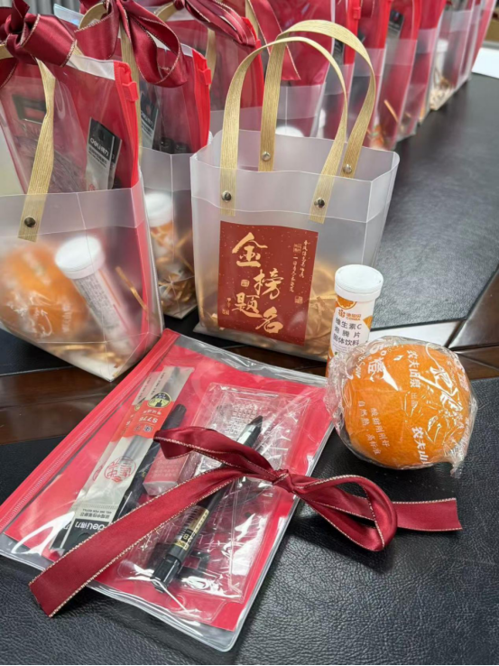 生物医药学院毕业班辅导员、班主任带着毕业班的学生干部一起亲手为每个考研学子写下了祝福明信片,一句句祝福中承载了辅导员老师对大家日常点滴的暖心记忆;承载了班主任们对大家成长路上的由衷祝福;承载了同学们同窗奋斗的友情岁月,让考研学子们在备考过程中感受到温暖。老师们带着祝福走向宿舍,送上内含考研一定“橙”功的水果,运气“旺旺”的牛奶、答题“棒棒”的糖果、幸运爆棚的“巧克力”、“鲮鲤附体”的钥匙扣等礼物的“加油锦囊”。