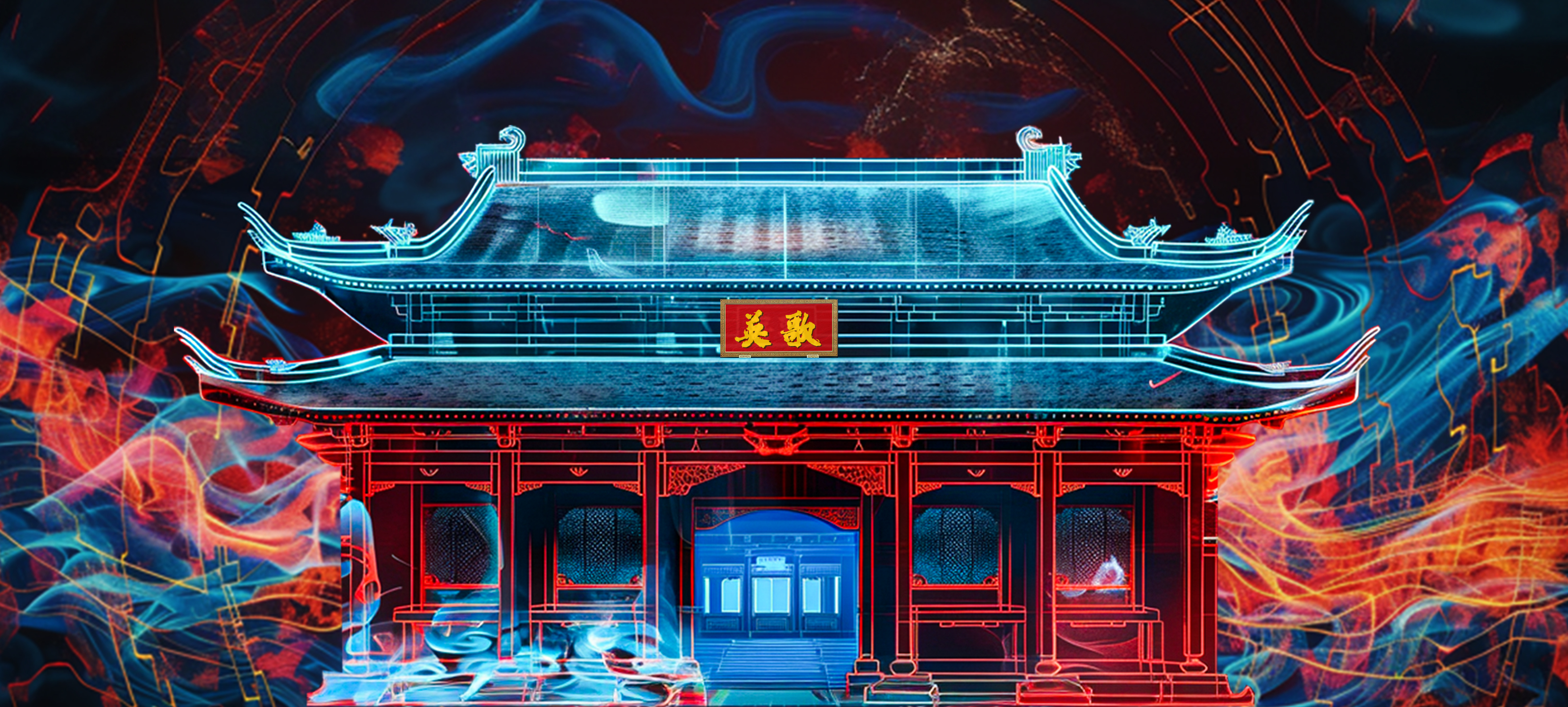 在大年初三播出的2025中国非遗春节联欢晚会上,潮汕英歌节目《一身正气》将传统的地方锣鼓与现代摇滚乐相融合,加入电音、鼓点和电流音效,保留了英歌的硬朗气质又兼具电子科技感。团队在舞美设计上以AIGC生成手段将潮汕祠堂民居、建筑纹样、潮州大鼓、水厝角头搬上舞台,以象征水火元素的蓝红为主色调,采用块状体块、光线动效、动感激光等视觉手法表现传统元素,营造出古典场景的科技未来感,为展现潮汕英歌“刚柔并济”的文化内涵,团队还在设计时还融入了潮州大鼓的节奏力量与潮汕民居水厝角头的柔韧线条,诠释“水火既济”的哲学观与艺术生命力,鼓点与光效联合律动,龙纹与脸谱此消彼长,视听一体化设计编织成一曲古今对话,尽显千年英歌的历史内涵与青春活力。