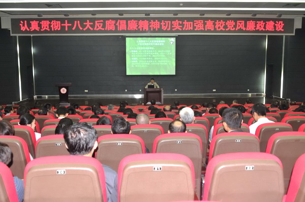 赵康指出,加强高校反腐倡廉建设,一是要明确高校反腐倡廉的主要任务。要坚持“标本兼治、综合治理、惩防并举、注重预防”的十六字方针,切实落实在党风廉政建设中的党委主体责任和纪委监督责任。二是要抓好高校党风廉政建设中的重点领域。严把基建项目、招生录取、设备仪器图书采购、科研经费、学术诚信、财务管理、校办企业等七个关口,切实加强对权力运行的制约监督。三是要坚定理想信念,不断增强党员干部拒腐防变能力。要恪守“园丁”风格,正确使用权力,抵御各种诱惑。最后,他用“廉于小者易,廉于大者难;廉于始者易,廉于终者难”的警句与大家共勉。