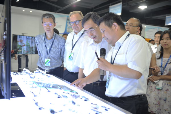 在高端装备展区,陈新详细介绍了我校2013年国家科技进步二等奖获奖项目产业化成果高速焊线机、固晶机、以及自主研发的精密检测设备、服务机器人等仪器设备,朱小丹详细讯问了一些装备的技术特点和产业化情况,并对创新院在设计创新服务方面所做出的成绩给以高度评价。