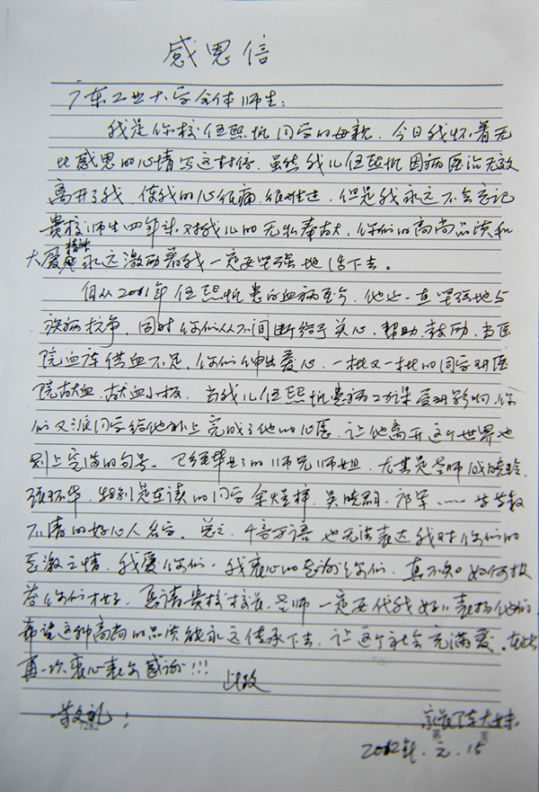 自从2011年伍熙帆患白血病至今,他也一直坚强地与疾病抗争,同时你们从不间断给予关心、帮助、鼓励,当医院血库供血不足,你们献出爱心,一批又一批的同学到医院献血,献血小板,当我儿伍熙帆患病,功课受到影响,你们又派同学给他补上完成了他的心愿,让他离开这个世界也划上圆满的句号。已经毕业了的师兄师姐,尤其是老师成晓玲、张环华,特别是在读的同学余煜梓、吴晓群、邝军……等等数不清的好心人名字,总之,千言万语也无法表达我对你们的感激之情,我爱你们,我衷心的感激你们,真不知道如何报答你们才好,恳请贵校校长、老师一定要代我好好表扬他们,希望这种高尚的品质能永远传承下去,让这个社会充满爱。在此,再一次衷心表示感谢!!!