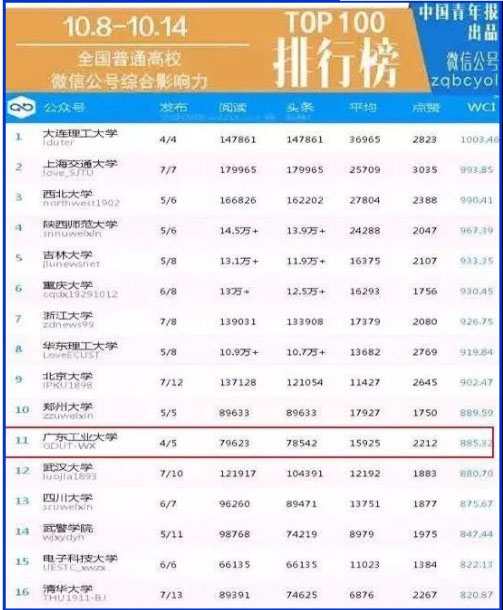 本网讯 10月16日,在中国青年报出品的全国普通高校微信公号排行榜【10.8-10.14】上,我校官微“安博app最新版下载”位列榜单第11名。在中国青年报出品的全国普通高校单周文章阅读量排行榜上,学校官微排名第7。
