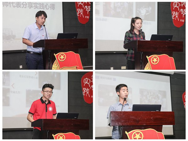 四名优秀实践师生代表结合自身实践经历,上台分享他们在实践过程中的心得和体会。管理学院“传颂红色史迹•追寻红色印记”党员实践队带队老师田艺广,建筑与城市规划学院“我为美丽乡村绘蓝图”志愿行动队伍吕佩仪同学,青马工程”井冈山革命教育基地学生骨干锻炼团蒋嘉豪同学,计算机学院“点燃希望之火,情暖留守儿童”实践队伍成员林禄滨同学做了发言。