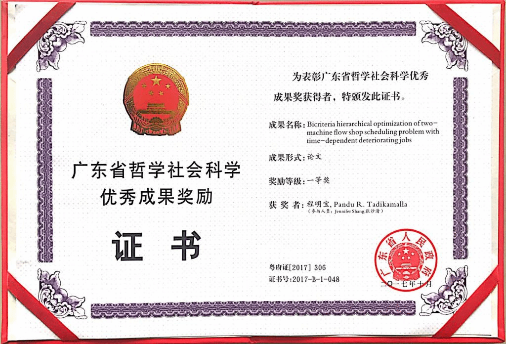 我校副校长张光宇教授等的《战略生态位管理的理论与实践》获评著作类一等奖,管理学院程明宝教授等的《Bicriteria hierarchical optimization of two-machine flow shop scheduling problem with time-dependent deteriorating jobs》获评论文类一等奖;艺术与设计学院院长方海教授等的《东竹西渐:明清时期中西方竹家具案例比较研究》、管理学院副院长黄蓉教授等的《税率差异、关联交易与企业价值》、管理学院韩小花教授等的《Modelling decision behaviours in pricing game of closed-loop supply chains》获评论文类二等奖;外国语学院王和玉副教授等的《英语将来事态句的最简句法分析》、管理学院陶毅等的《Joint planning of berth and yard allocation in transshipment terminals using multi-cluster stacking strategy》获评论文类三等奖。