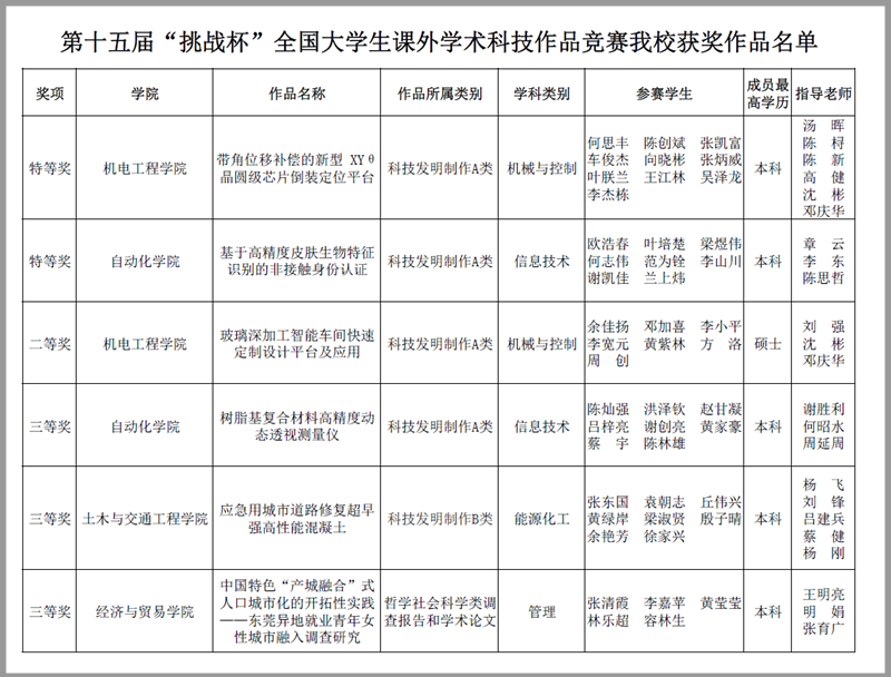 第十五届“挑战杯”全国大学生课外学术科技作品竞赛我校获奖作品名单
